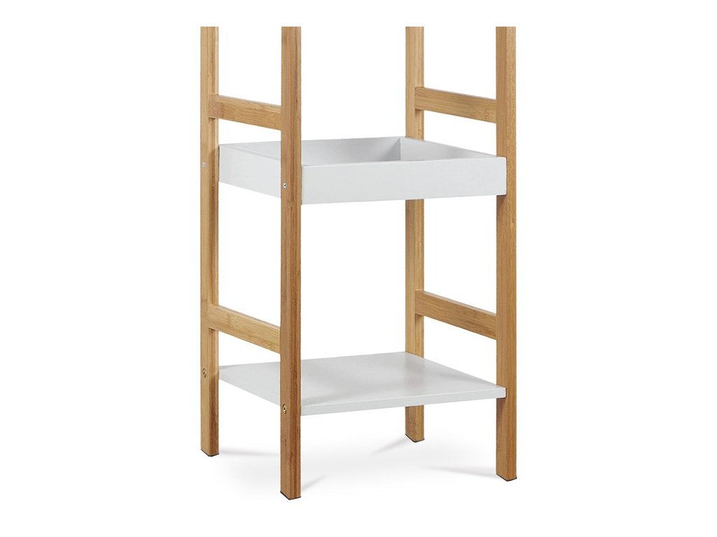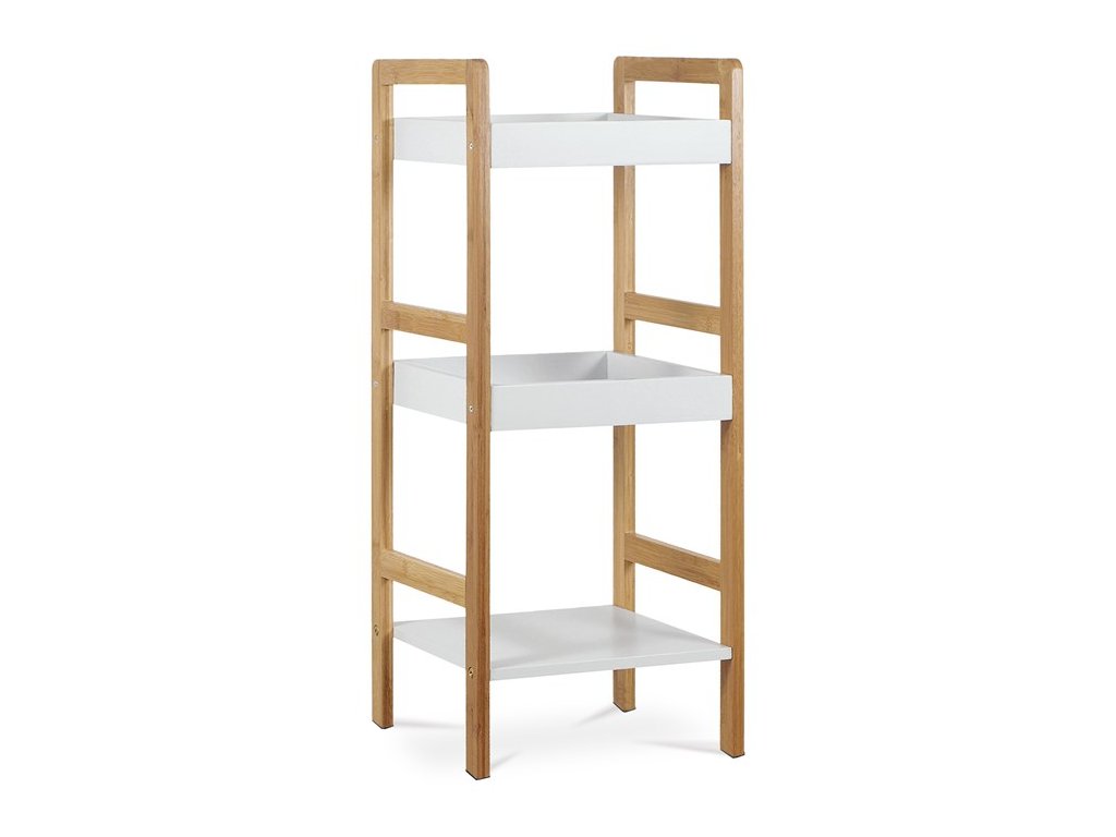 Multifunkční třípolicový regál ve Skandinávském stylu. Nosná konstrukce je vyrobena z masivního bambusu, lakovaného kvalitním trasparentním lakem. Bambus jako takový opdpuzuje vodu a touto povrchovou úpravou dosahuje velmi dobré voděodolnosti. Police jsou vyrobeny z MDF desek a lakovány kvalitním polyuretanovým bílým matným lakem. Čímž i u nich je zaručena voděodolnost. Tímto zpracováním je regál vhodný do koupelen, ale ideální bude i v ostatních místech domácnosti.Horní dvě police mají boky ze všech stran, třetí je klasická rovná. Jejich nosnost je až 3 kg, celková 9 kg.