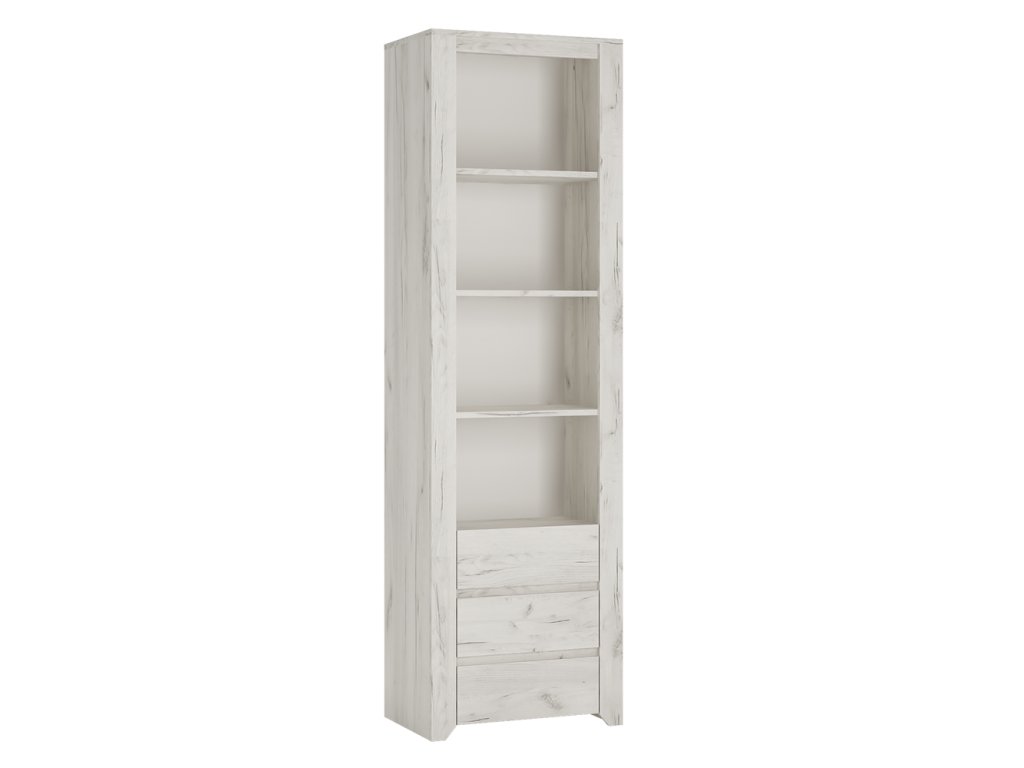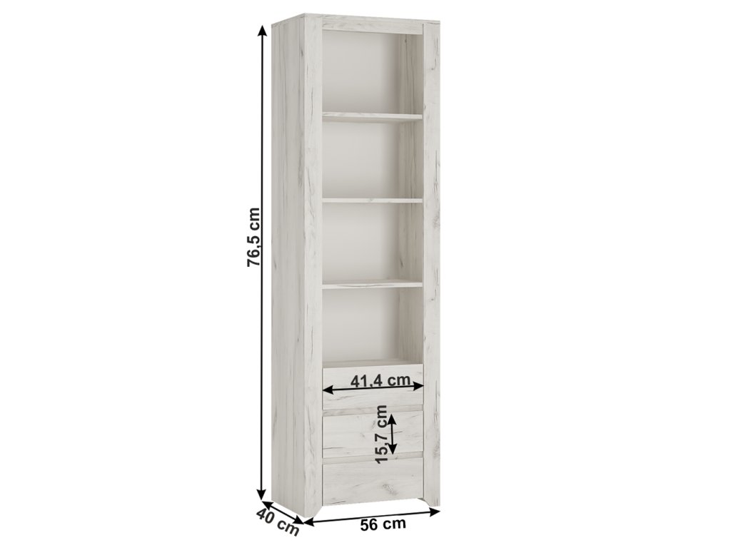 Regál Typ 11 ze sestavy ANGEL v elegantním dekoru bílá craft nabízí praktické členění:- 4 otevřené police a 3 zásuvky