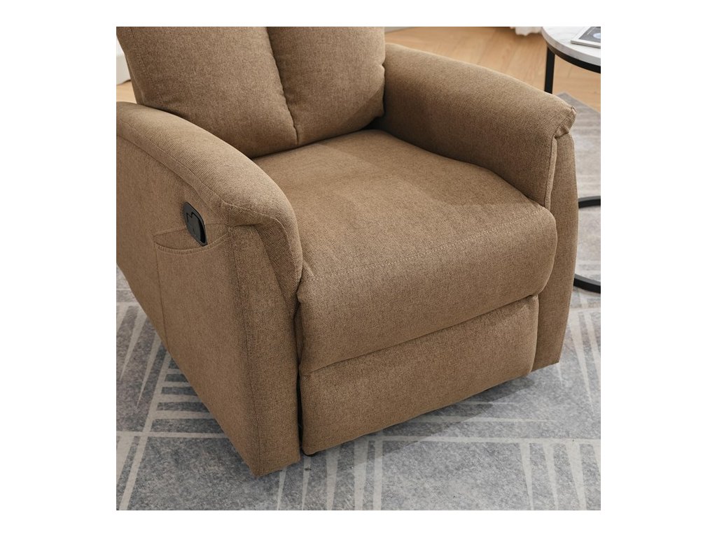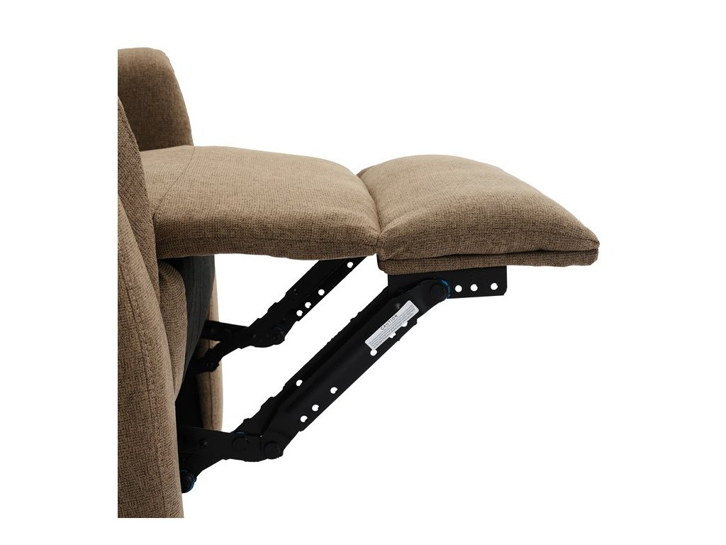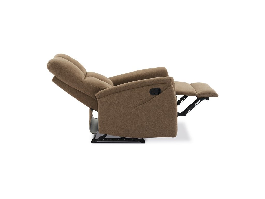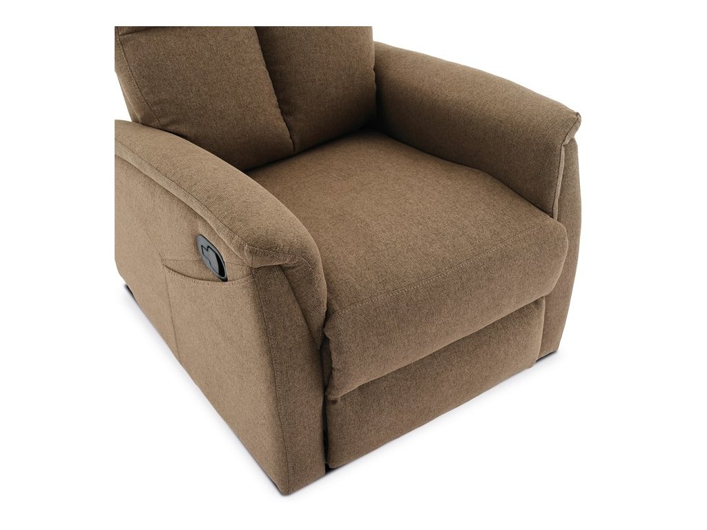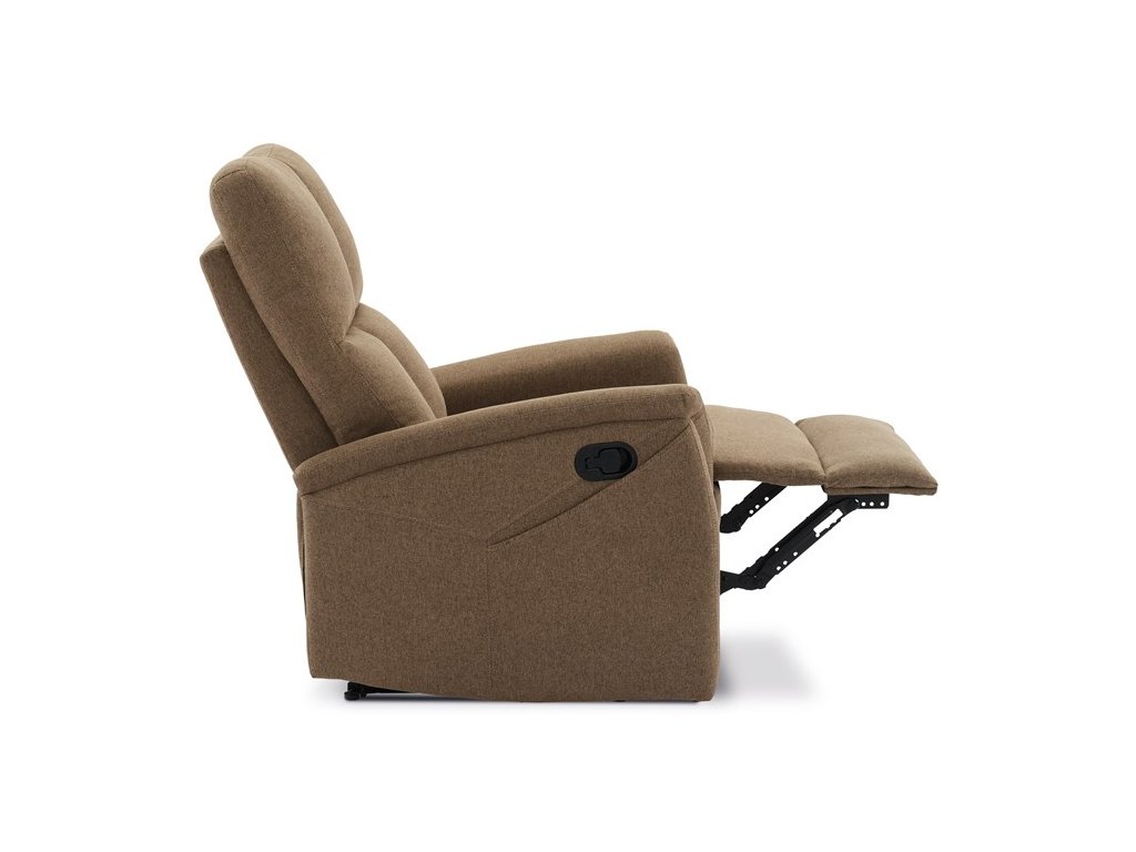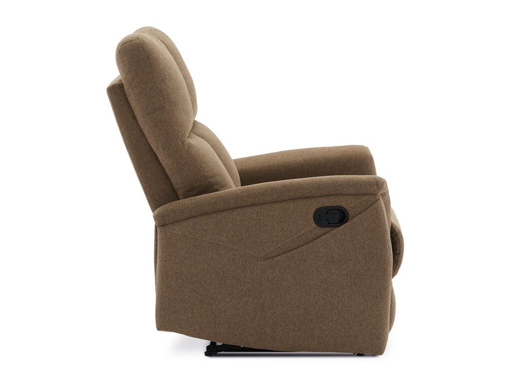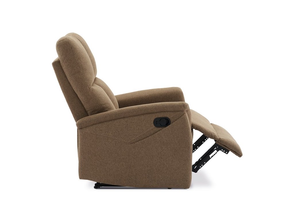 Polohovací křeslo, hnědé barvy, s manuálním ovládáním. Toto komfortní křeslo je vybaveno postranní pákou, která umožňuje snadné nastavení sklonu zadní opěrky a zvednutí podnožky.Na boku křesla je praktická kapsa pro uložení drobností, jako jsou časopisy nebo dálkový ovladač. Křeslo je navrženo pro maximální pohodlí a ergonomii, poskytuje vynikající podporu zad a relaxaci.