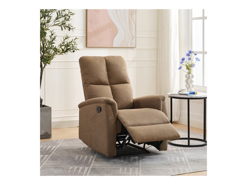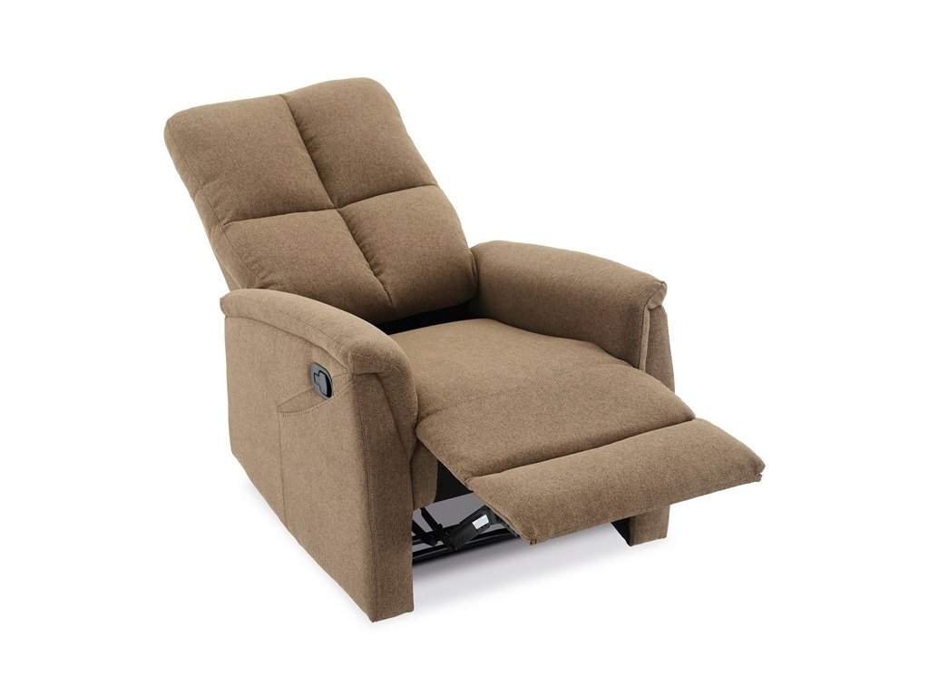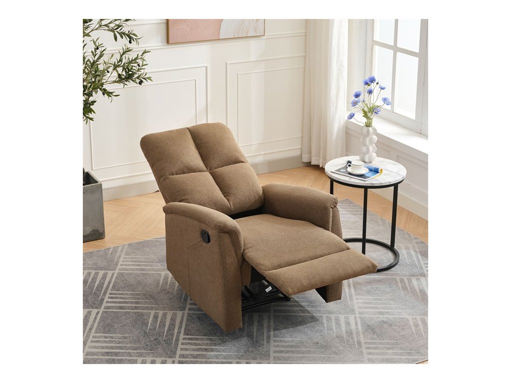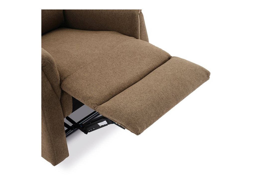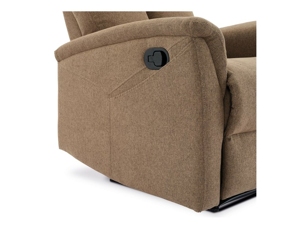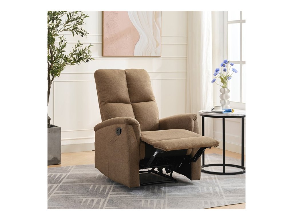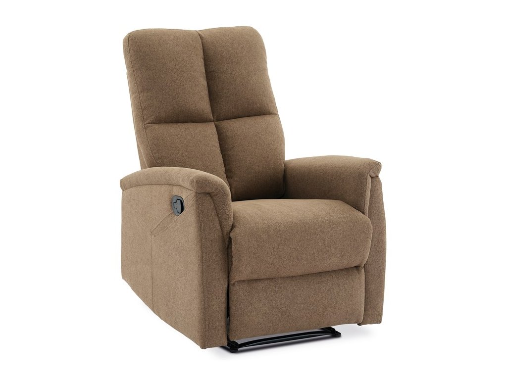 Polohovací křeslo, hnědé barvy, s manuálním ovládáním. Toto komfortní křeslo je vybaveno postranní pákou, která umožňuje snadné nastavení sklonu zadní opěrky a zvednutí podnožky.Na boku křesla je praktická kapsa pro uložení drobností, jako jsou časopisy nebo dálkový ovladač. Křeslo je navrženo pro maximální pohodlí a ergonomii, poskytuje vynikající podporu zad a relaxaci.