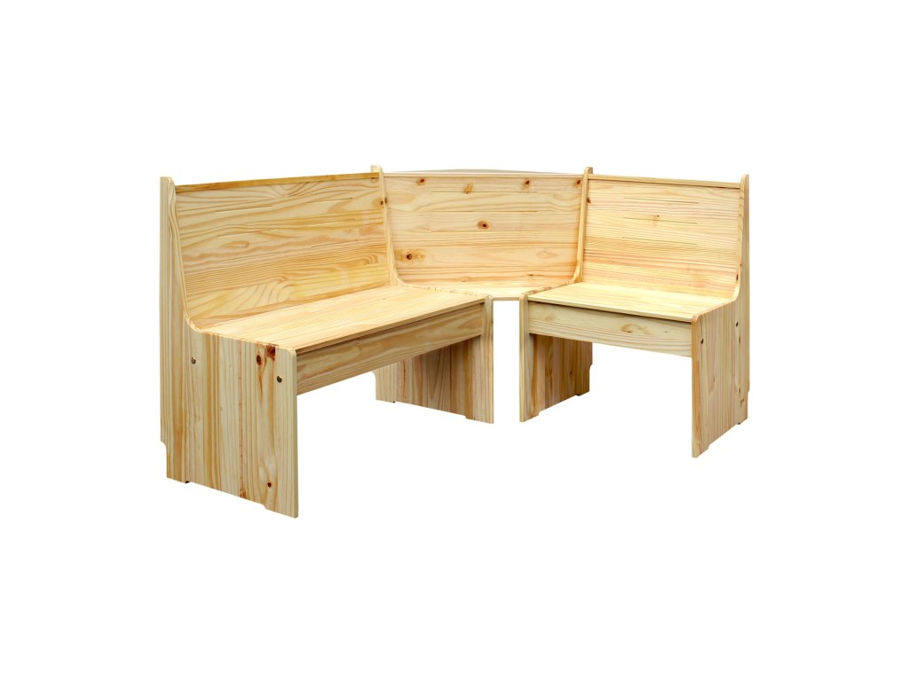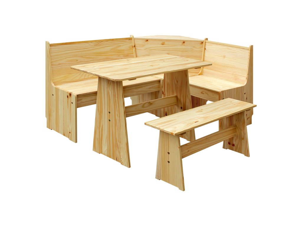 Rohová jídelní souprava, materiál masiv borovice, lakované provedení rohová lavice, stůl a lavice, rozměr rohové lavice (š/h/v) 152/119 × 51 × 86 cm, výška sedu 43 cm, hloubka sedu 39 cm, šířka sedu 91,5 cm, širší část, 58,5 cm, užší část, rozměr stolu (š/h/v) 100 × 60 × 73 cm, rozměr lavice (š/h/v) 92 × 28 × 43 cm, možnost sestavení na levou i pravou stranu.Doplňkové parametry