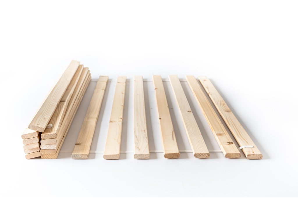 Dřevěný, laťkový, rolovatelný rošt. Rozměr: 160x200 cm. Výška roštu: 2 - 2,5 cm. Počet latí: 18 ks. Šířka latí: 6 cm. Mezera mezi latěmi: 5 cm.