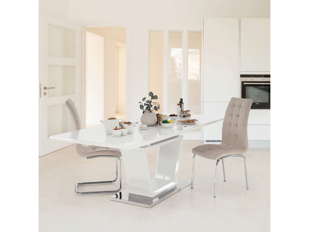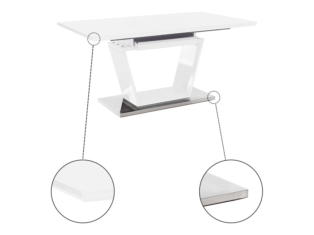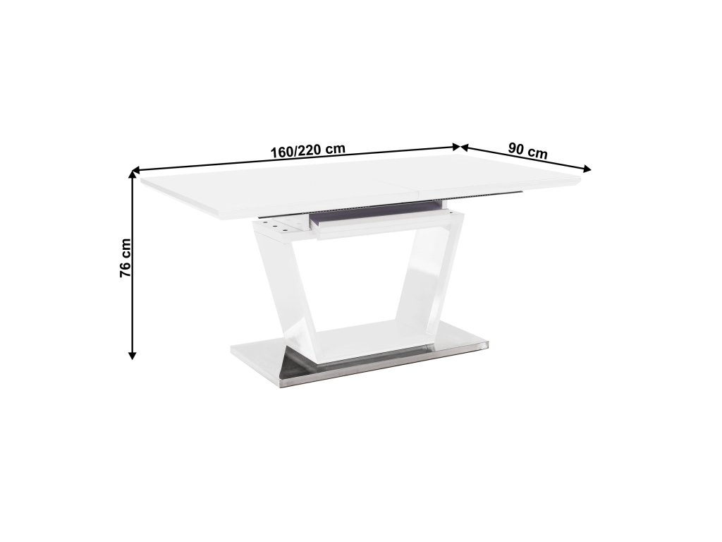 Luxusní a designový rozkládací jídelní stůl, barevné provedení: bílá s extra vysokým leskem HG, materiál: MDF + oceľ, ŠxHxV: 160-220x90x76 cm.Vrchní část: 40 mm