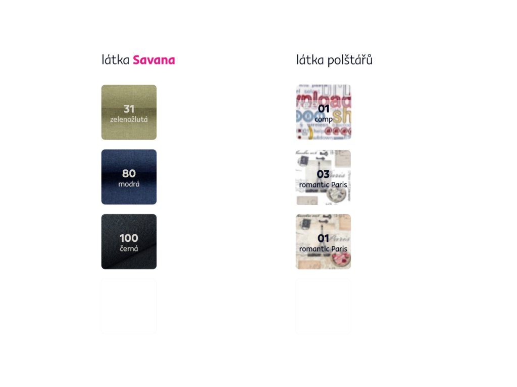 Možnost objednání ve 3 barevných provedeních látky Savana v kombinaci se vzorovanou látkou v ceně 7.590,-Kč. Při individuální objednávce je třeba zaplatit 10% zálohu z dané částky. Po uhrazení zálohy bude Vaša objednávka zadána do výroby. Dodací lhůta 8-10 týdnů.