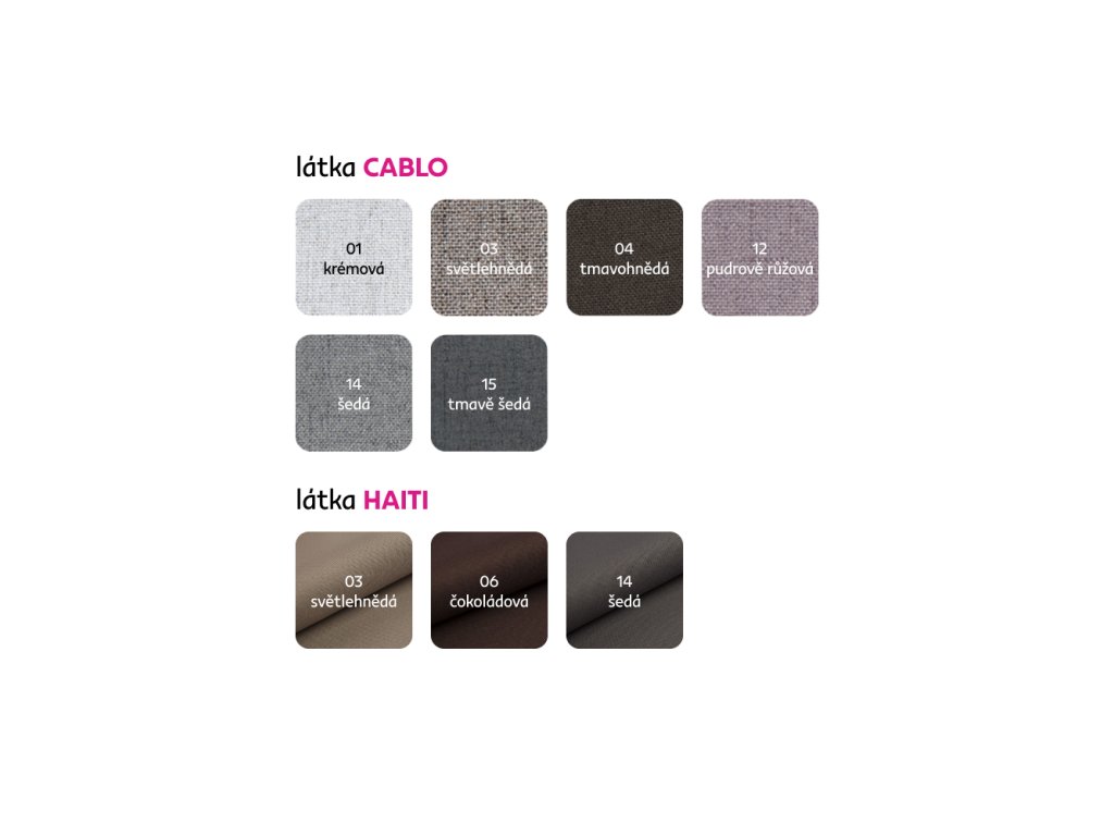 Možnost objednání ve 3 barevných provedeních látky Haiti nebo v 6 barevných provedeních látky Cablo, v ceně: 9.390,-Kč, dodací lhůta 8-10 týdnů. Při individuální objednávce je třeba zaplatit 10% zálohu z dané částky. Po uhrazení zálohy bude Vaša objednávka zadána do výroby.