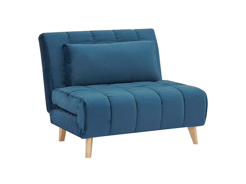 Rozkládací pohovka MILY VELVET spojuje moderní design a praktičnost. Potah z měkké látky aksamit v modré barvě a dřevěné nožky v dekoru buku dodají interiéru eleganci.Parametry: