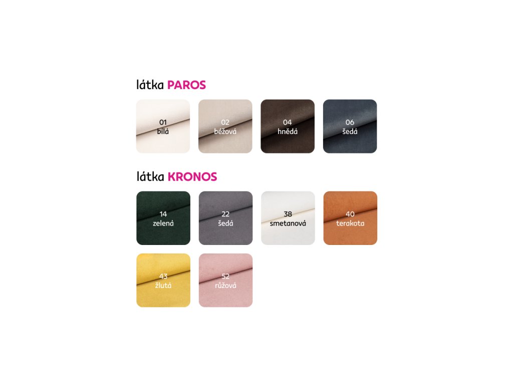Nabízíme vám možnost vybrat si ze 4 barevných provedení látky Paros a ze 6 barevných provedení látky Kronos.