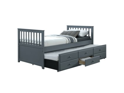 Jednolůžková postel z masivu borovice s voskovanou úpravou. Součástí jsou dvě rošty a výsuvná přistýlka, v zadní části praktická police. Matraci je nutné dokoupit (90×200 cm).