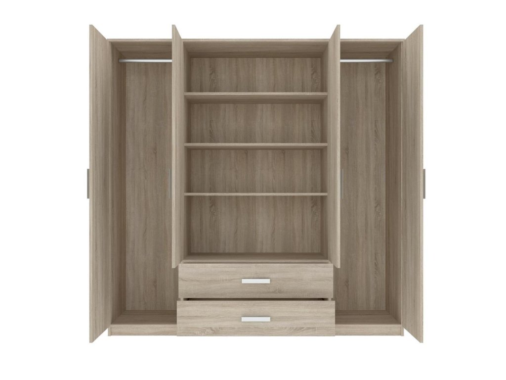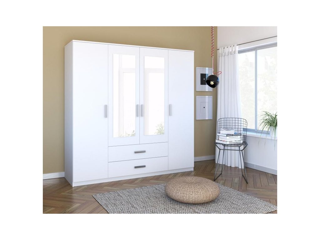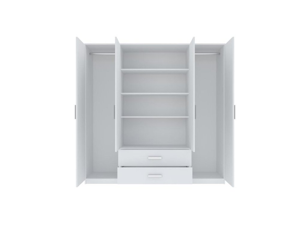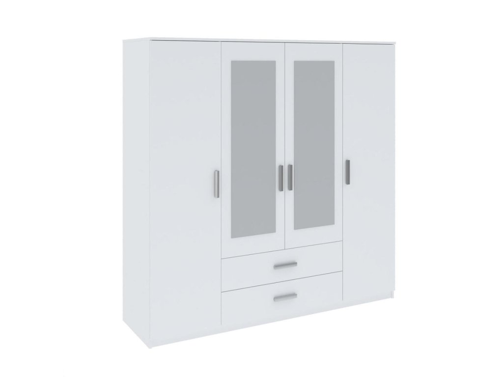 Šatní skříň čtyřdveřová se dvěma zásuvkami, je vyrobena z kvalitní LTD desky v barevném provedení bílá. Uvnitř skříně jsou dvě šatní tyče po stranách a uprostřed policový systém, dveře jsou doplněny zrcadlem. V naší nabídce naleznete více variant nábytku této řady. Dodáváme v demontovaném stavu.Doplňkové parametry