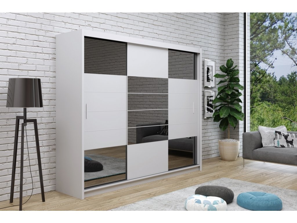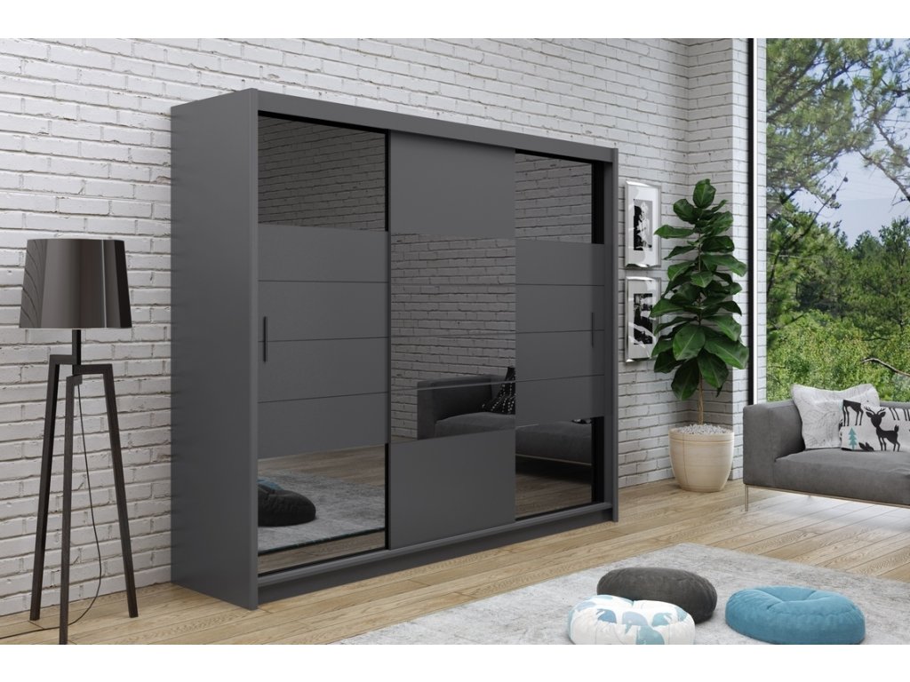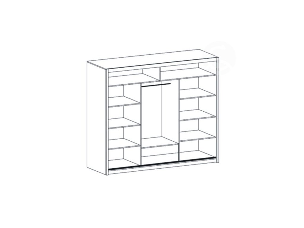 Šatní skříň s posuvnými dveřmi v moderním provedení, které nikdy není monotónní nebo nudné. Korpus i dvířka jsou z kvalitní LTD desky. Korpus je bílý, dveře jsou v barvě bílá a jsou dekorovány grafitovým zrcadlem. Uspořádání polic viz. perokresba. Dodáváme v demontovaném stavu.Doplňkové parametry