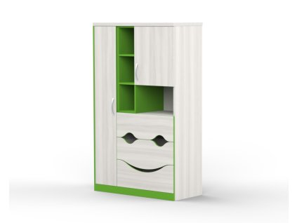 Skříň z masivní borovice s lakovaným povrchem. Vlevo šatní tyč a police, vpravo 3 police, dole 2 zásuvky s kovovými pojezdy. Doporučený nástavec: 8168K.