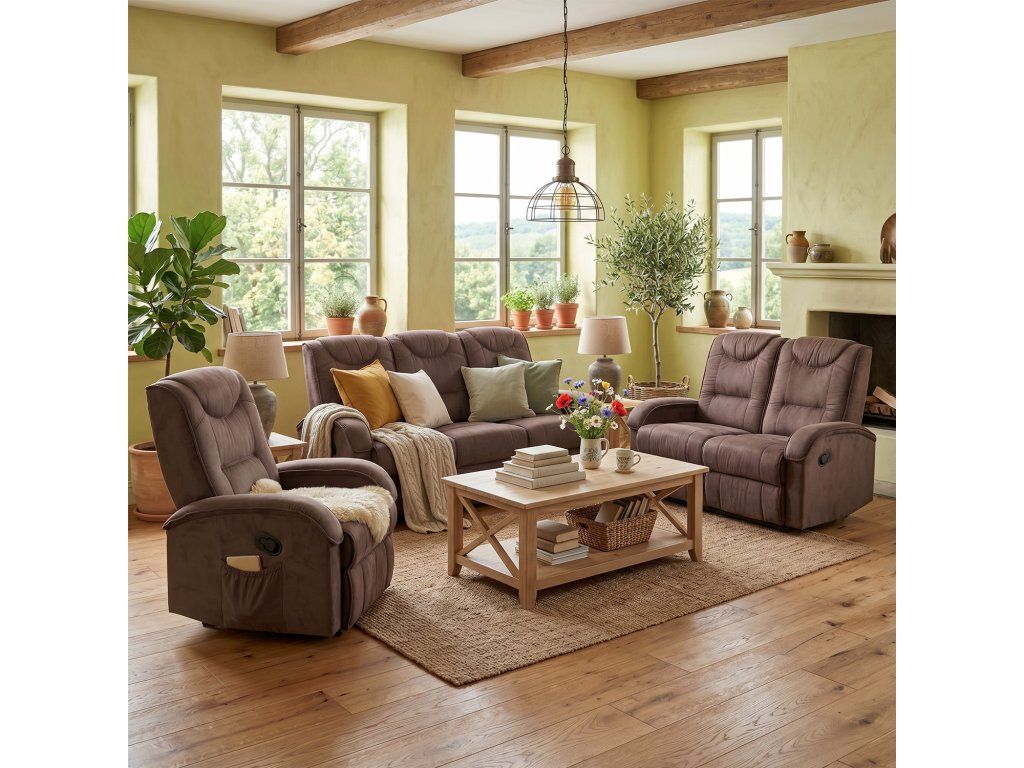 Potah broušená kůže – imitace, barevné provedení hnědá, masážní křeslo: elektrické ovládání, 8 masážních programů, 2 stupně intenzity, nastavení oblasti masáže (zádová nebo bederní), automatické vypnutí po 15 nebo 30 minutách, rozměr (š/h/v) = 81 × 95 × 93 cm, hmotnost = 45 kg dvojkřeslo: jeden pevný a jeden polohovací sedák, rozměr (š/h/v) = 132 × 94 × 93 cm, hmotnost = 57 kg trojkřeslo: dva pevné a jeden polohovací sedák, rozměr (š/h/v) = 188 × 94 × 93 cm, hmotnost = 70 kgDoplňkové parametry
