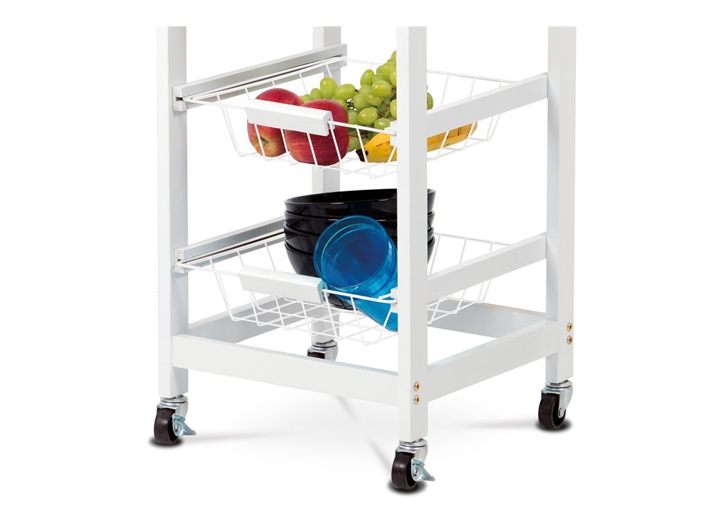 Servírovací stolek je šikovný a praktický doplněk do každé domácnosti. Plní funkci nejen při servírování, ale výborně slouží jako mobilní úložný prostor, a to nejen do kuchyně. Ve třech patrech s výsuvnými drátěnými koši s praktickou dřevěnou úchytkou, nabízí nepřeberné možnosti ukládání od ovoce až po nádobí či jiné kuchyňské potřeby. Deska je zhotovena z masivního bambusu v přírodním odstínu, opatřena silnou deskou odolného transparentního laku. Tím je zaručena eliminace poškození desky rozlitou tekutinou. Navíc bambus jako takový odpuzuje vodu. Krytý úložný prostor tvoří jedna menší zásuvka s chromovaným madlem. Zde je možné uložit příbory či drobné kuchyňské předměty, popř. jako skryté místo na sladkosti.Konstrukce vozíku je z lakovaných MDF přířezů v bílé matné barvě. Kolečka jsou plastová, obě přední jsou opatřeny brzdičkami. Koše jsou svařené z kovových drátů a chromované. Velikost bambusové desky je 37 x 37 cm, což je příjemné zvětšení kuchyňské plochy a navíc mobilní.