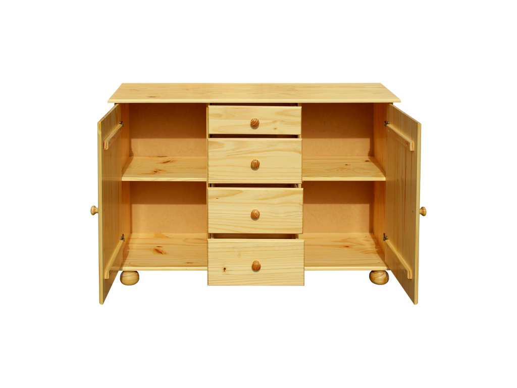 Spodní část tvoří příborník se čtyřmi zásuvkami s kovovými pojezdy a dvěma skříňkami s dvířky, vybavenými policí. Nástavec nabízí další úložný prostor za dvěma prosklenými dvířky, ideální např. pro vystavení nádobí nebo dekorací.