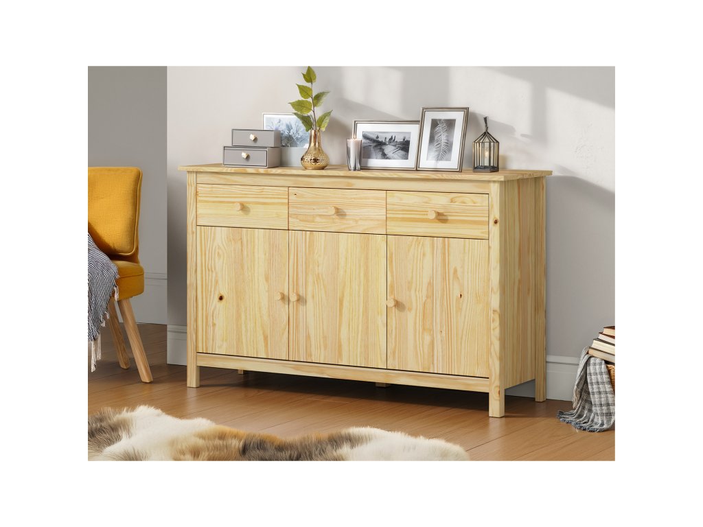 - Příborník TORINO 8062 – nabízí tři prostorné zásuvky s kovovými pojezdy a troje dvířka, za nimiž se ukrývá praktický úložný prostor pro nádobí, textil nebo další vybavení.