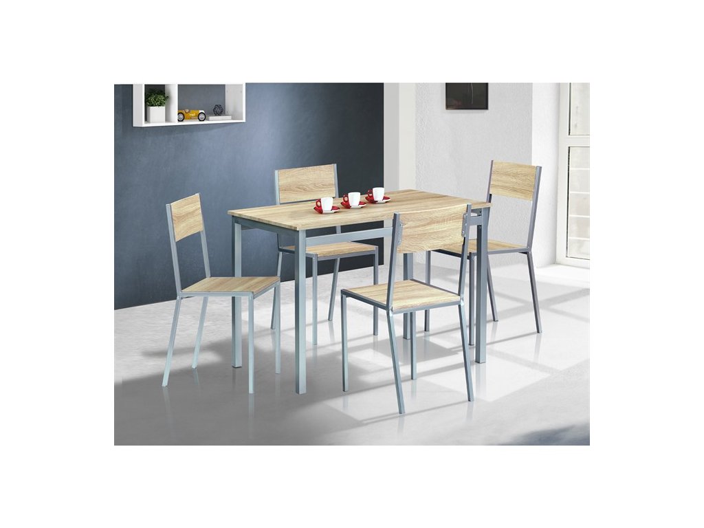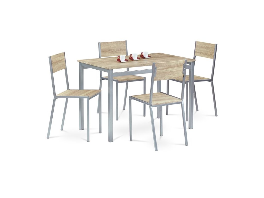 Jídelní set 1+4, v barevném provedení 3D dub sonoma, stříbrný lak. Materiál konstrukce je kov, desky stolu, sedáků a opěráků je MDF.Doplňkové parametry