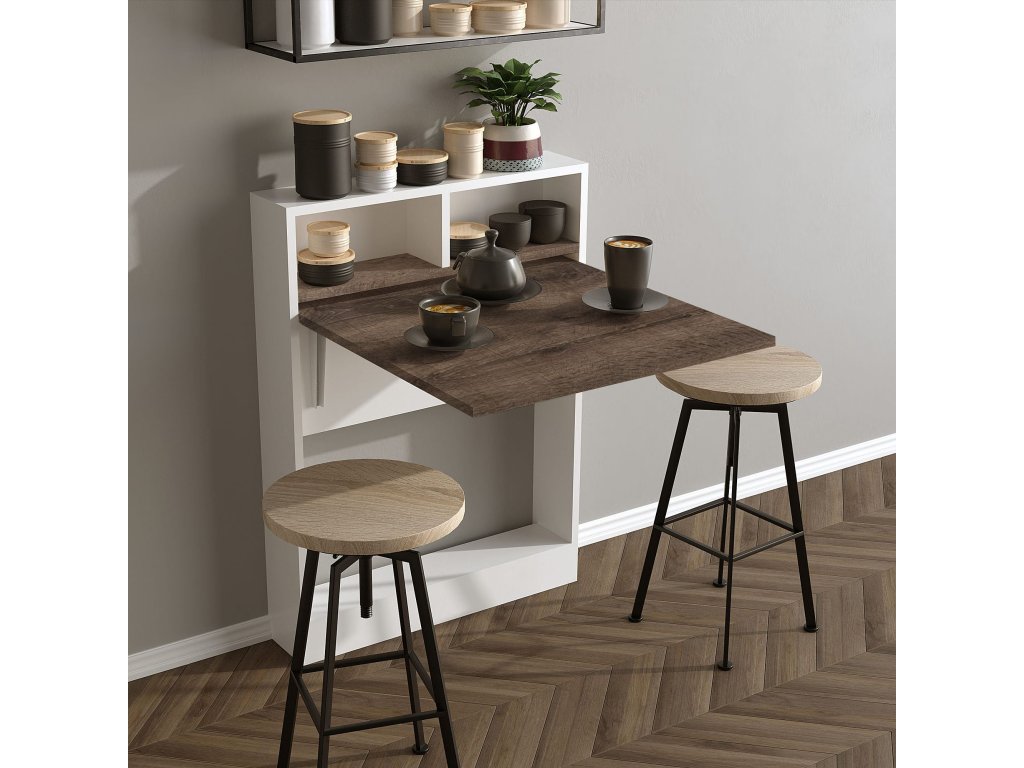 Sklápěcí stolek BRACKED je chytré řešení do malých bytů. Po sklopení šetří místo, po rozložení nabídne plnohodnotnou plochu i úložné police.