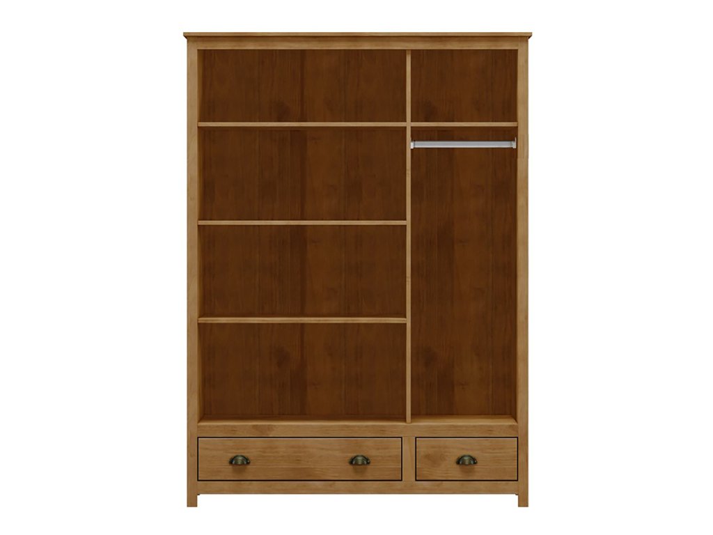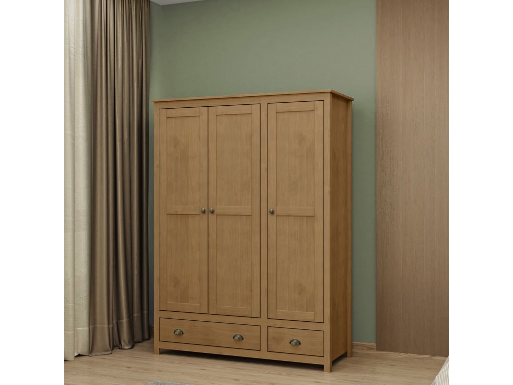 Skříň 3dveřová TOPAZIO 206282D dubMasivní 3dveřová skříň TOPAZIO v elegantním dubovém provedení nabízí nejen krásný vzhled, ale i promyšlený úložný prostor. Levá část skříně je vybavena třemi praktickými policemi, pravá část pak jednou policí a kovovou šatní tyčí pro zavěšení oděvů. Dvě spodní zásuvky s kovovými pojezdy poskytují další úložné místo. Skříň je vyrobena z kvalitního borovicového masivu a doplněna kovovými úchytkami, které podtrhují její klasický styl.