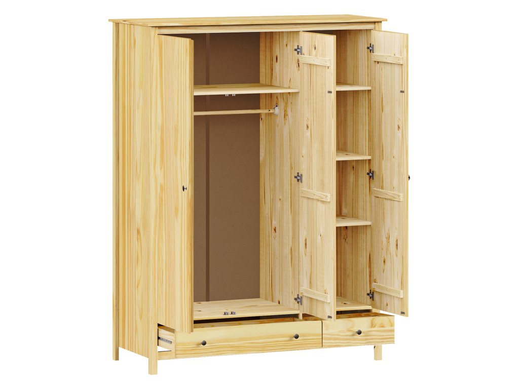 Skříň 3dveřová TORINO 8089K je vyrobena z masivní borovice a opatřena lakovaným povrchem, který zvýrazňuje přirozenou kresbu dřeva. Disponuje kovovými úchytkami a praktickým vnitřním uspořádáním – prostor je rozdělen v poměru 2:1. Ve větší části najdete šatní tyč a polici, v užší části pak tři police pro přehledné uložení oblečení či doplňků. Ve spodní části se nacházejí dvě zásuvky s kovovými pojezdy. Doporučujeme kombinovat s nástavcem 8189K pro ještě více úložného prostoru.Doplňkové parametry