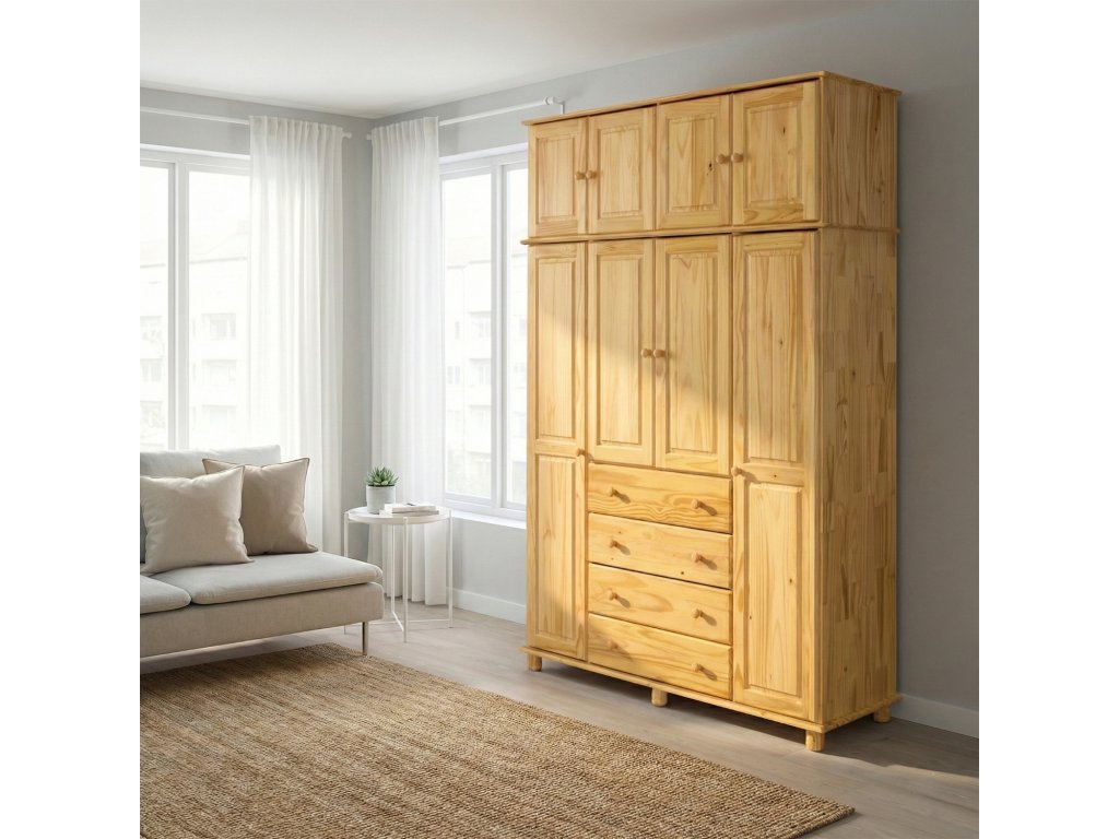 materiál masiv borovice, lakované provedení, čtyři široké zásuvky s kovovými pojezdy, v levé části dvě šatní tyče, ve střední části 1 police a v pravé části 3 police doporučený nástavec 8853Doplňkové parametry