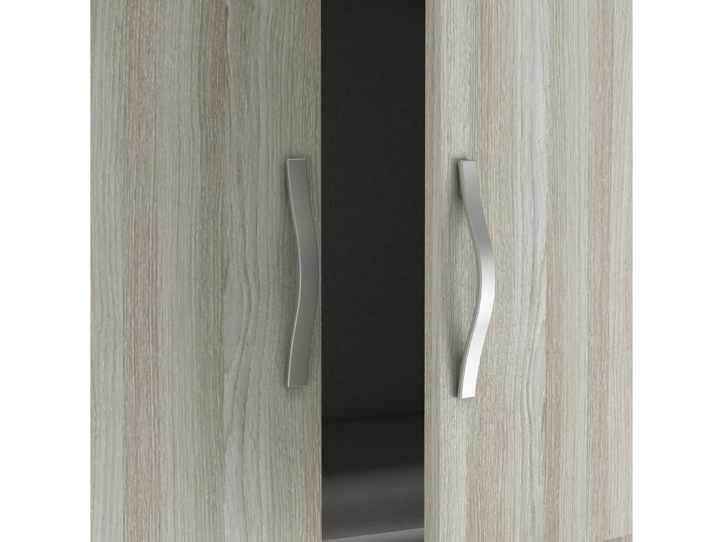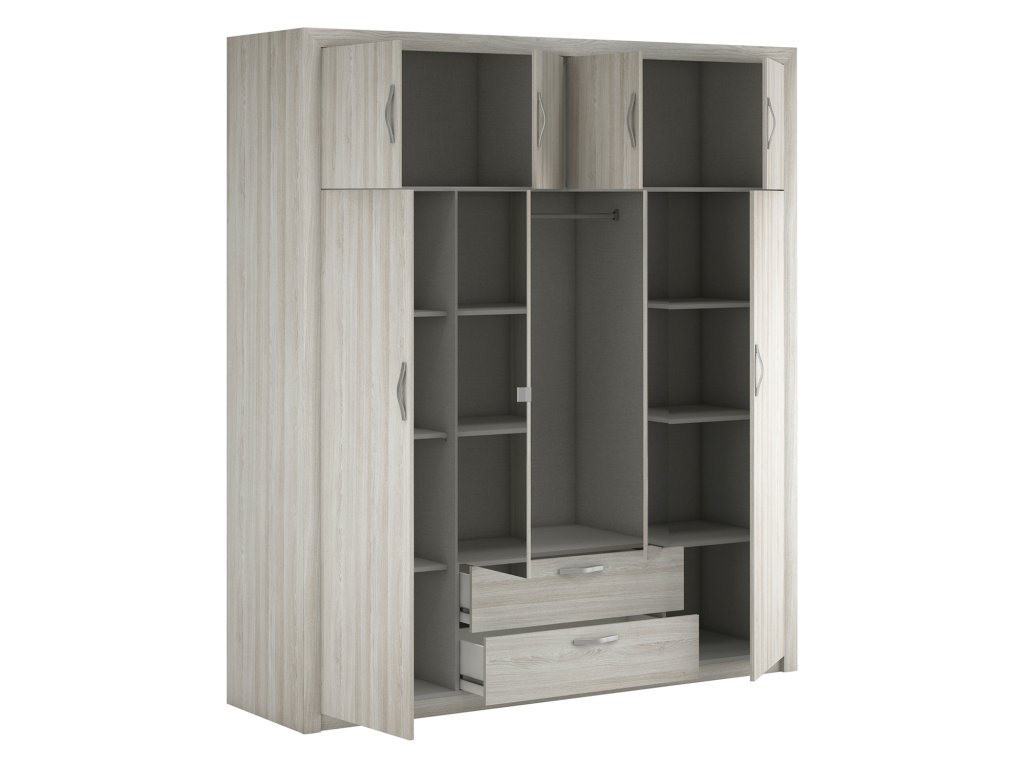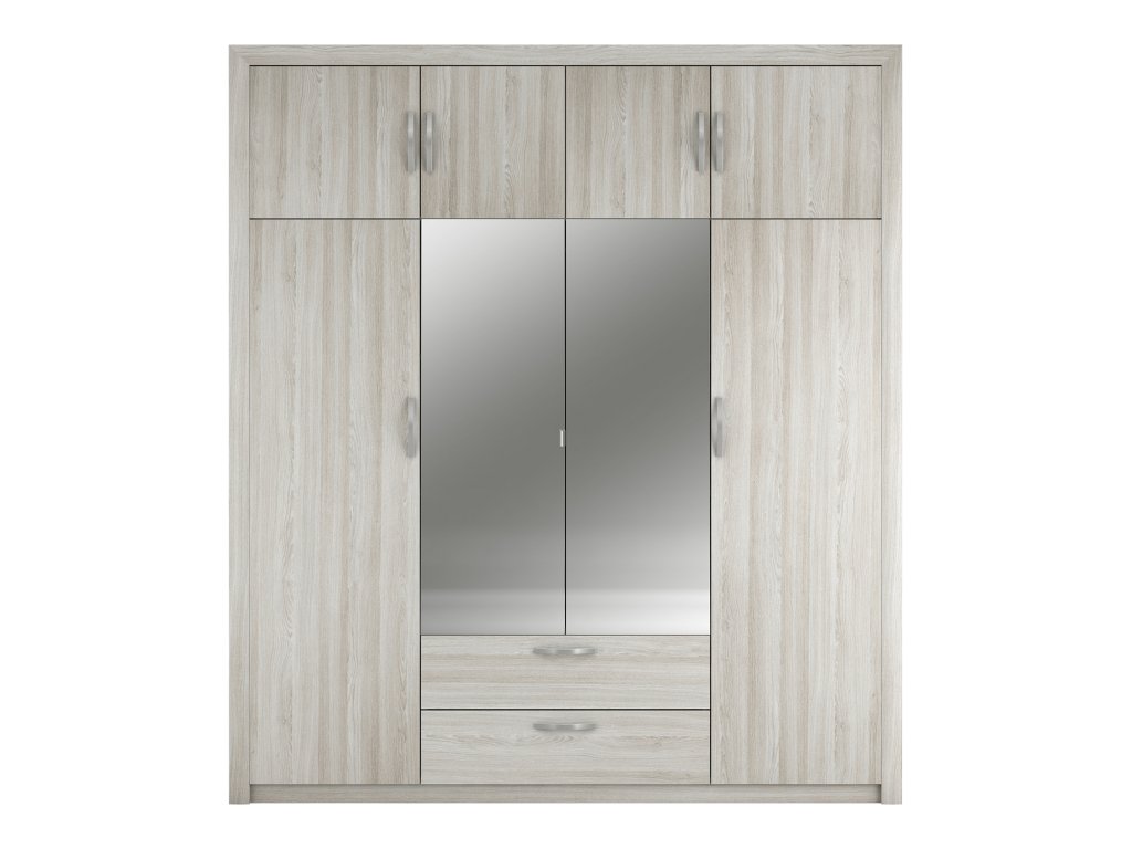 Šatní skříň, barevné provedení dub Shannon, prostor dělený v poměru 1:2:1, nástavec rozdělený na 2 stejné části je součástí skříně, v každé užší části 3 police, z toho 2 variabilní, rozměr police (š/h) 55 × 49 cm, širší část zrcadlové dveře, šatní tyč, v dolní části 2 zásuvky s kovovými pojezdy, rozměr zásuvky (š/h/v) 79 × 37 × 15 cm, záda dutinkový plast.Doplňkové parametry