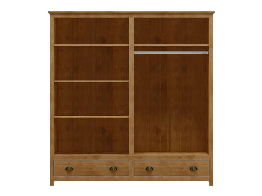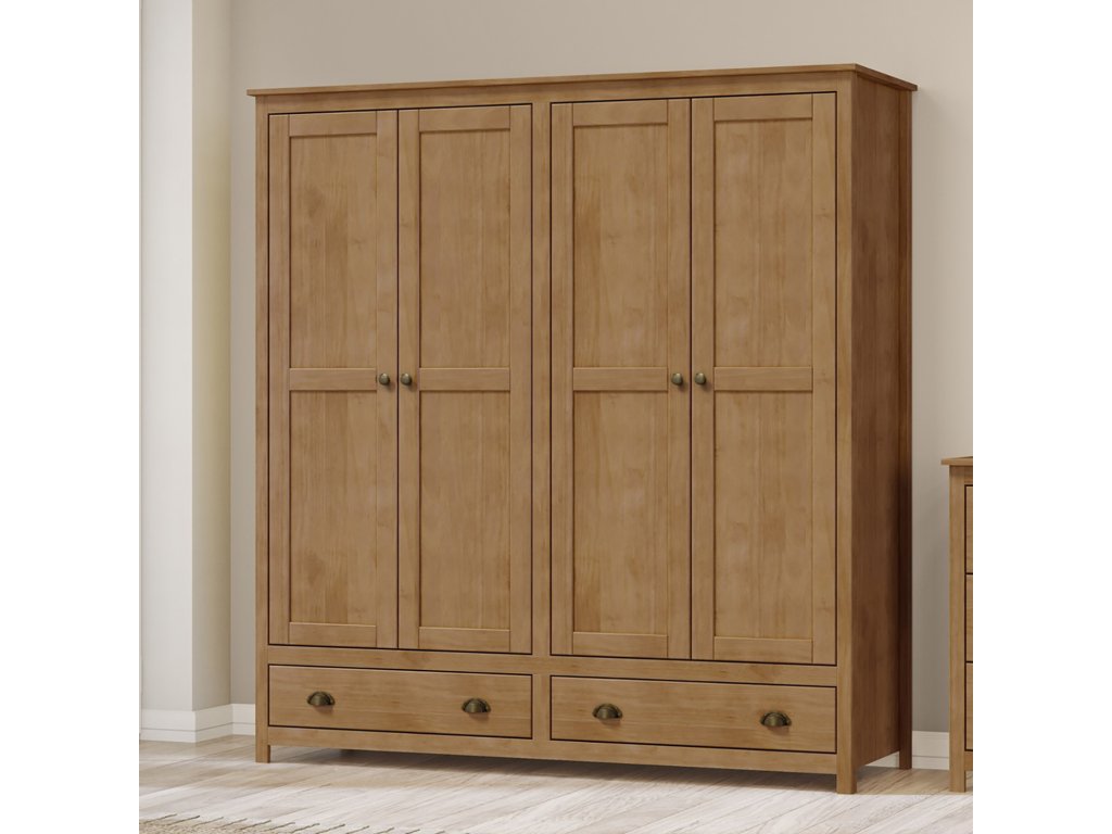 Skříň 4dveřová TOPAZIO 206283D dubČtyřdveřová skříň TOPAZIO v přírodním dubovém provedení kombinuje nadčasový design s praktickým vnitřním uspořádáním. Vyrobena z kvalitního masivu borovice, nabízí dostatek úložného prostoru pro vaše oblečení i doplňky. Levá část je vybavena třemi prostornými policemi, pravá část pak jednou policí a kovovou šatní tyčí pro zavěšení oděvů. Dvě spodní zásuvky s kovovými pojezdy jsou ideální pro uložení drobnějších věcí. Kovové úchytky podtrhují klasický vzhled skříně.