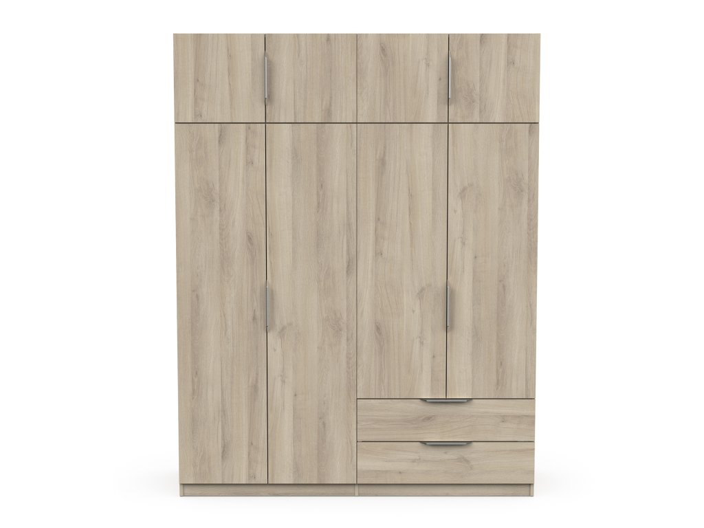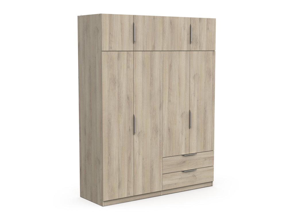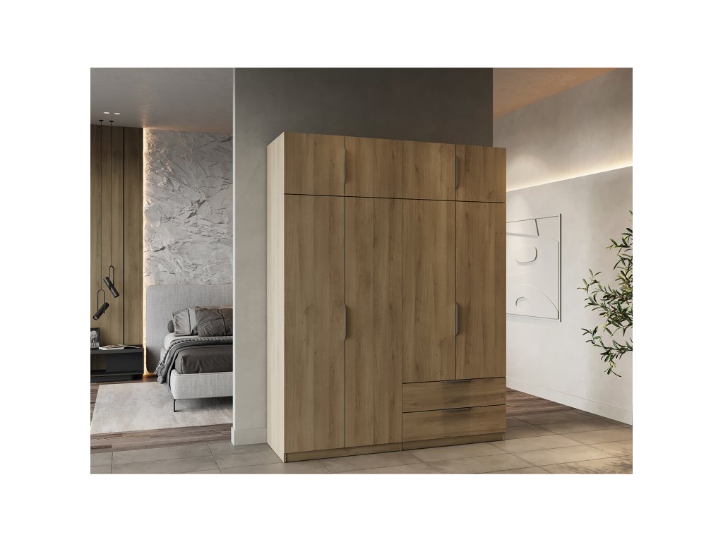 Šatní skříň, barevné provedení dub Kronberg, prostor dělený na poloviny, v levé části šatní tyč, v pravé části 2 police a 2 zásuvky s kovovými pojezdy, v horní části dva úložné prostory, maximální nosnosti uvedeny v návodu k montáži.Doplňkové parametry