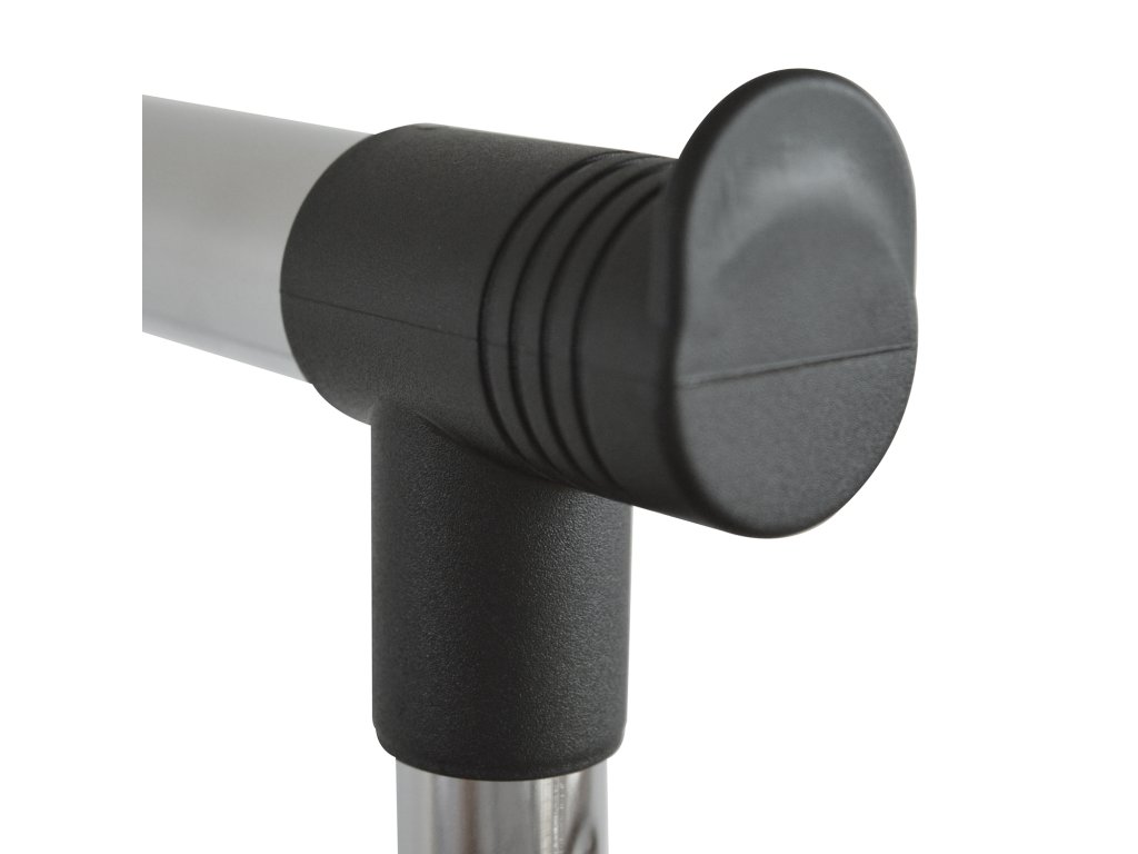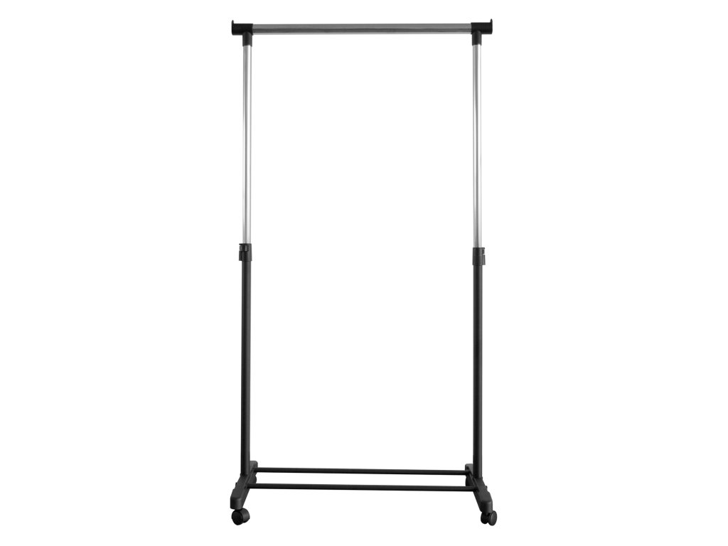 Stojan na šaty, materiál kombinace PVC a pochromovaného kovu, barevné provedení černá / stříbrná, 1 věšáková tyč, výškově nastavitelná, pojízdný na kolečkách.Doplňkové parametry