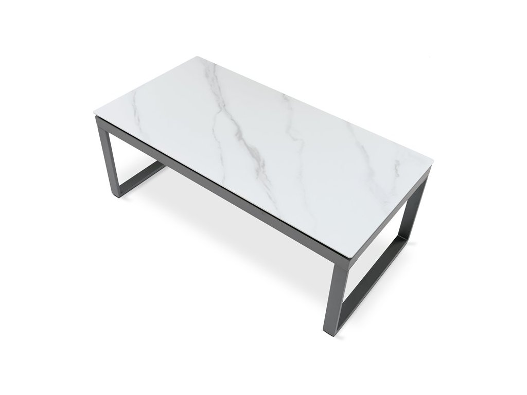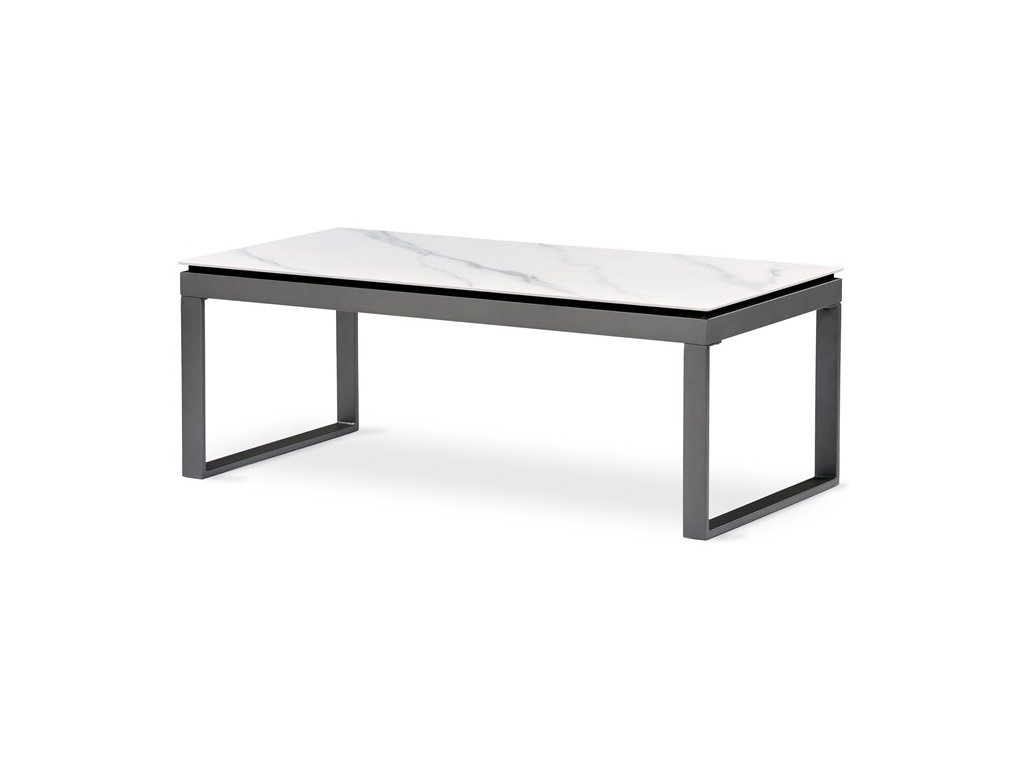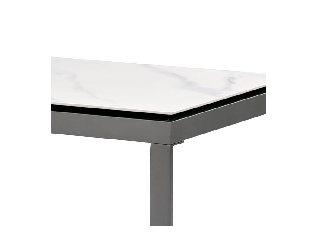 Luxusní konferenční stolek v industriálním stylu, který se stane nedílnou součástí domácnosti laděnou do industriálního či moderního stylu a vynikne svoji elegancí, jednoduchostí a optickou lehkostí i nádhernou sněhobílou kresbou desky.Odkládací deska je vyrobena ze slinutého kamene v dekoru bílý matný mramor "Snow Mountain" a celá je nadsazena nad minimalistého kovový rám ve velmi žádaném šedém trendy odstínu "Gunmetal grey". Tento rám doplňuje podnož ve tvaru "U" ve stejném barevném odstínu.