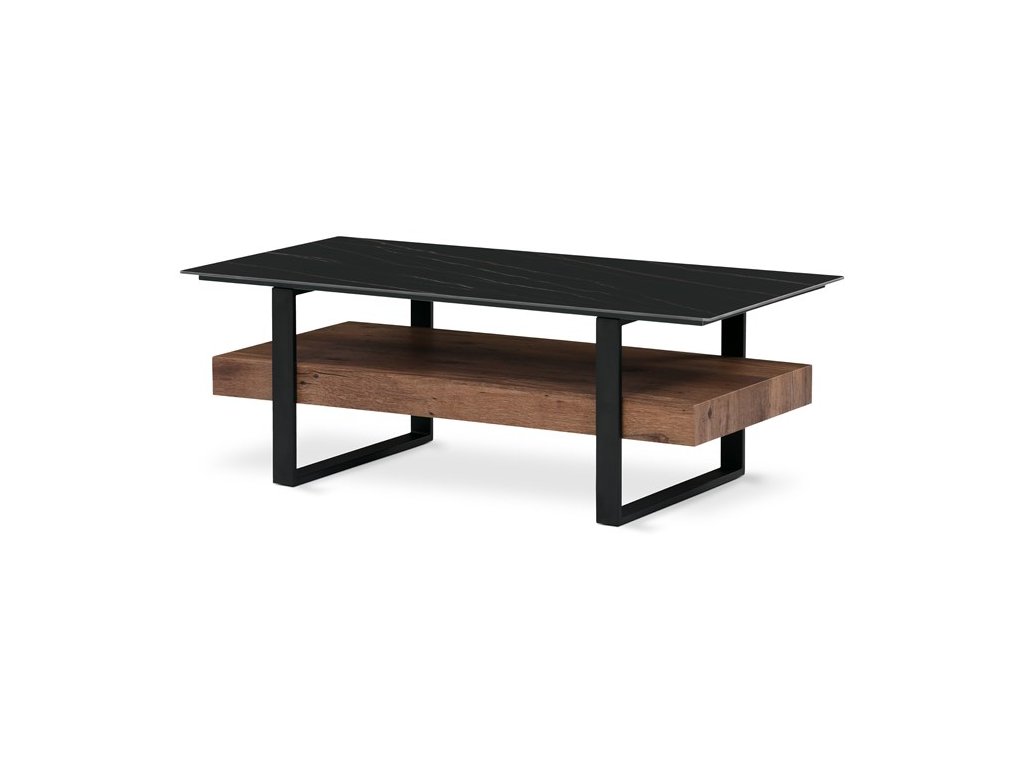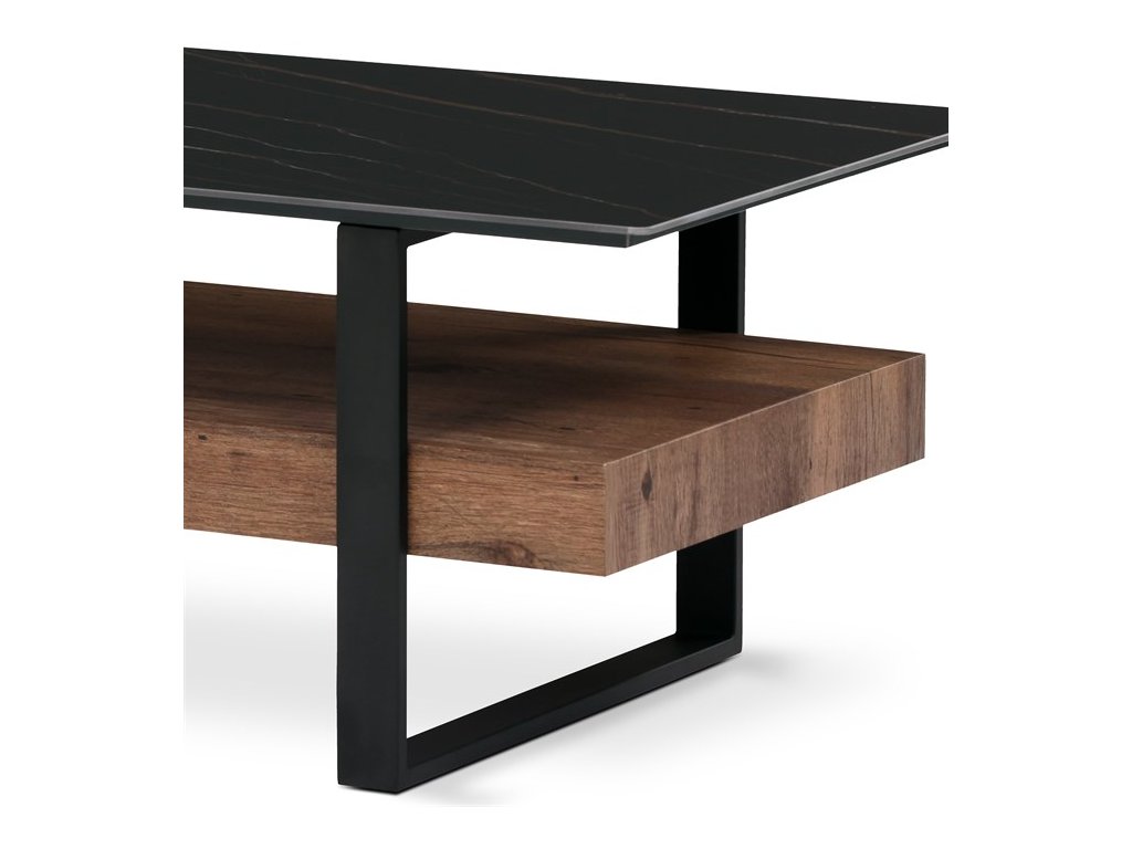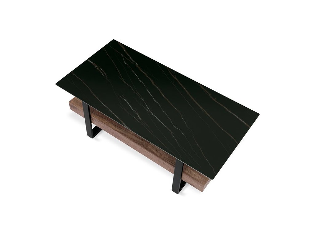 Luxusní konferenční stolek v industriálním stylu, který se stane nedílnou součástí domácnosti laděnou do industriálního či moderního stylu a vynikne svoji zajímavou solitérní konstrukcí i nádhernou černozlatou kresbou desky.Odkládací deska je vyrobena ze slinutého kamene v dekoru černý matný mramor "Lauren Black Gold" a celá je nadsazena nad kovový rám, který tvoří zároveň i podnož. Konstrukce velmi praktické masivní police je z MDF v dekoru matná třešeň.