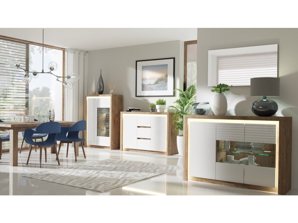 Televizní stolek s LED osvětlením v moderním bezúchytovém provedení. Kolekce nábytku v sobě spojuje jednoduchost, originální vzhled a funkčnost. Nábytek je vyroben z kvalitního lamina ohraničeného ABS páskou, korpus je v barevném provedení dub ribbeck, výklopná dvířka jsou v barvě bílá lesk, doplněno lištou z MDF. Dvířka jsou vybaveny systémem tichého dovírání. Kolekce se skládá z mnoha prvků a tento široký výběr Vám zaručí sestavit si nábytek podle svých vlastních představ a přání. Dodáváme v demontovaném stavu.Doplňkové parametry