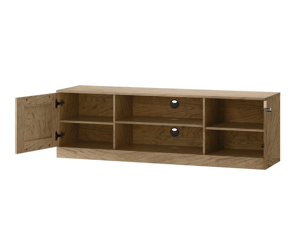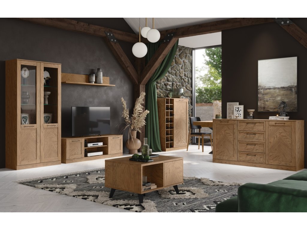 Televizní stolek se dvěma dvířky v nadčasovém provedení. Korpus je vyroben z přírodní dýhy v barvě dub rustikální, dvířka jsou vyrobeny z masivu v kombinaci s přírodní dýhou v zajímavém dekoru rybí kost v provedení dub rustikální olejovaný. Úchyty jsou kovové v barvě černá mat. Dvířka disponují systémem tichého dovírání. Dodáváme již ve smontovaném stavu.Doplňkové parametry