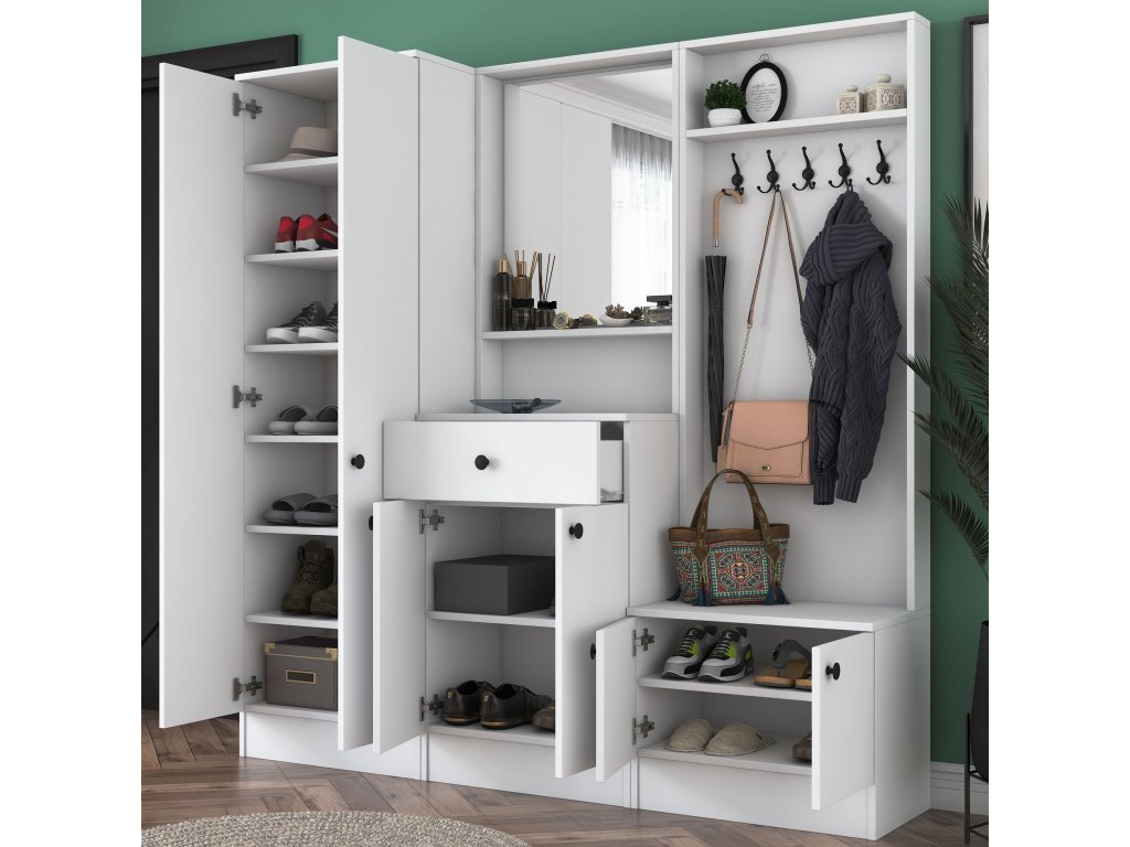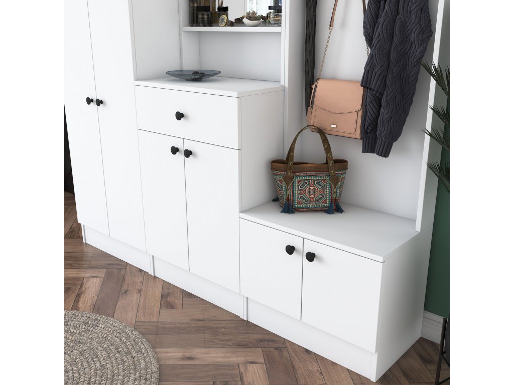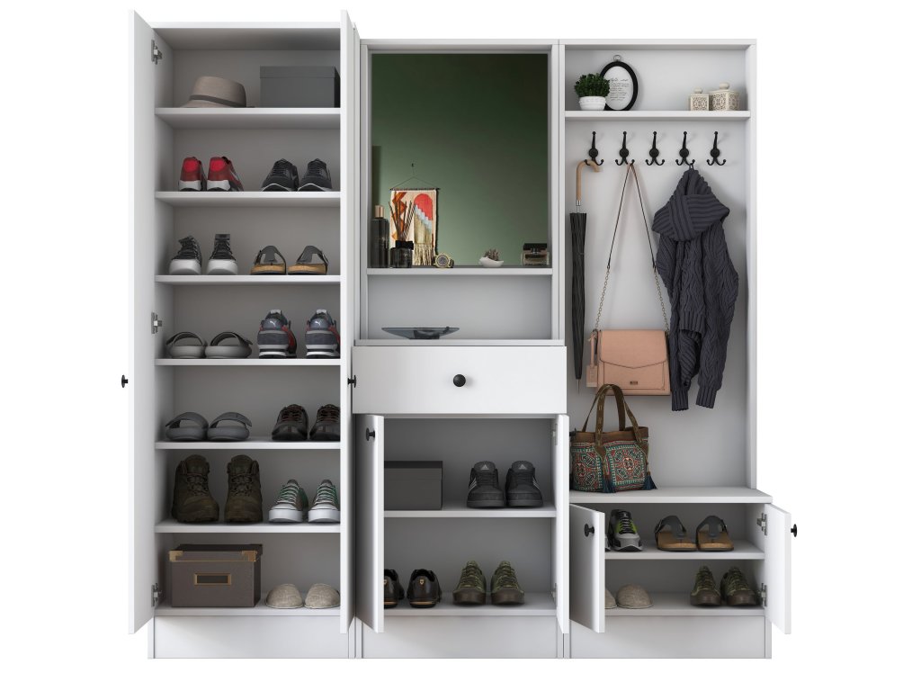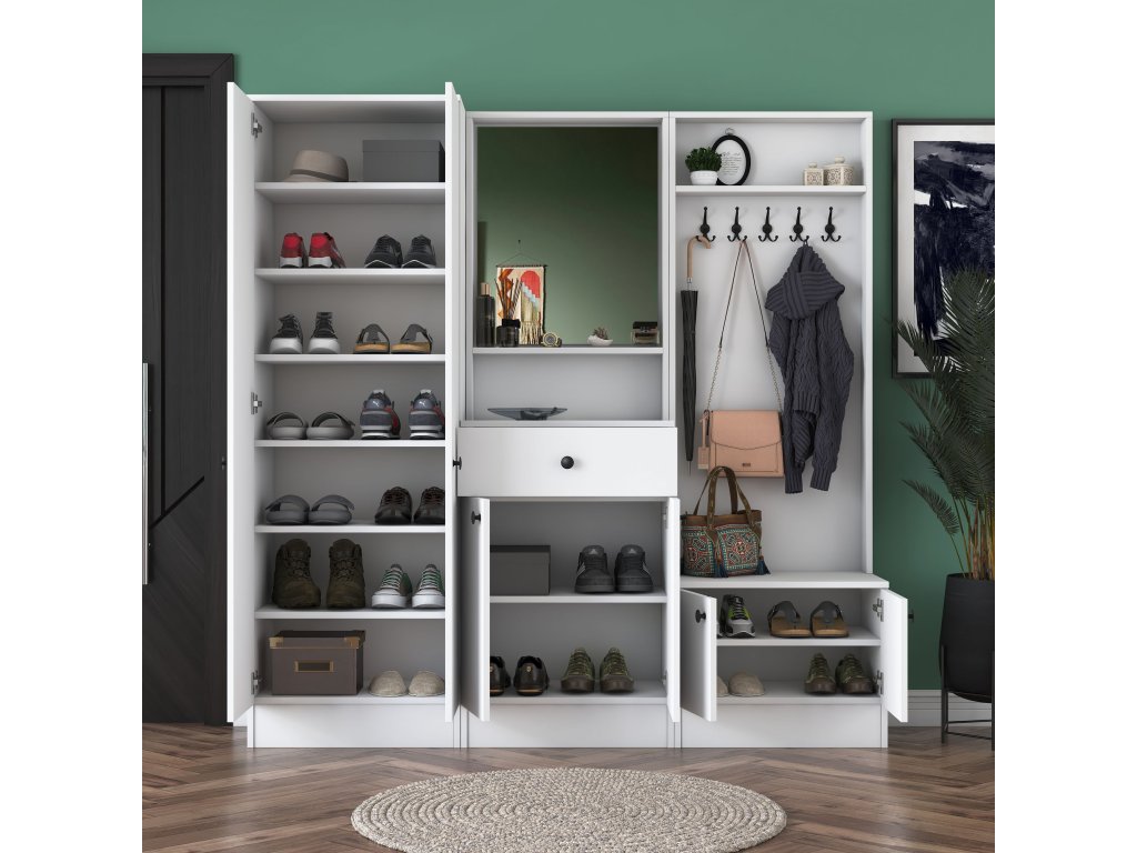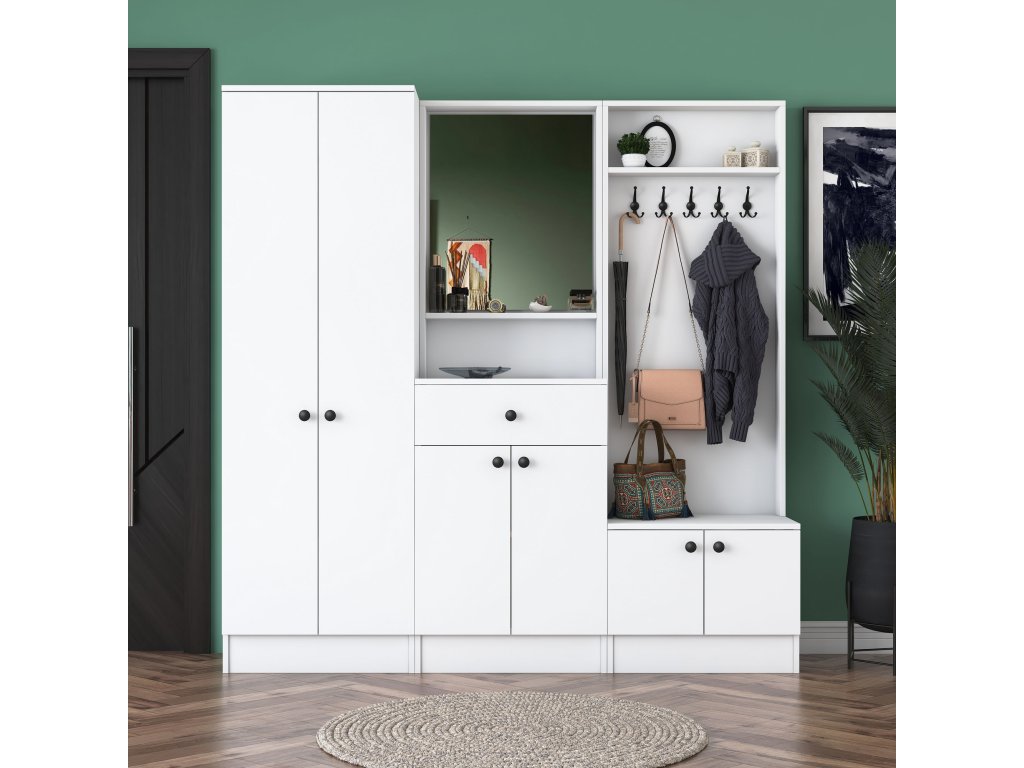 Předsíňová stěna TORTONA spojuje minimalistický design s chytrým úložným prostorem. Díky zrcadlu a promyšlenému uspořádání působí předsíň vzdušně a vždy upraveně.