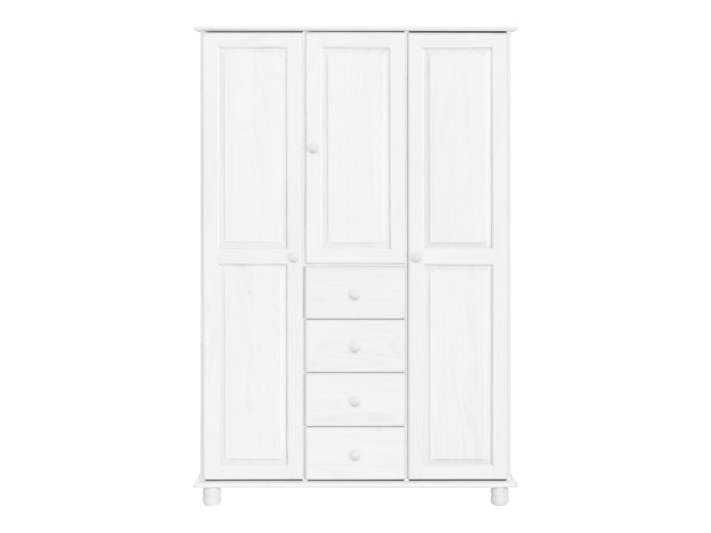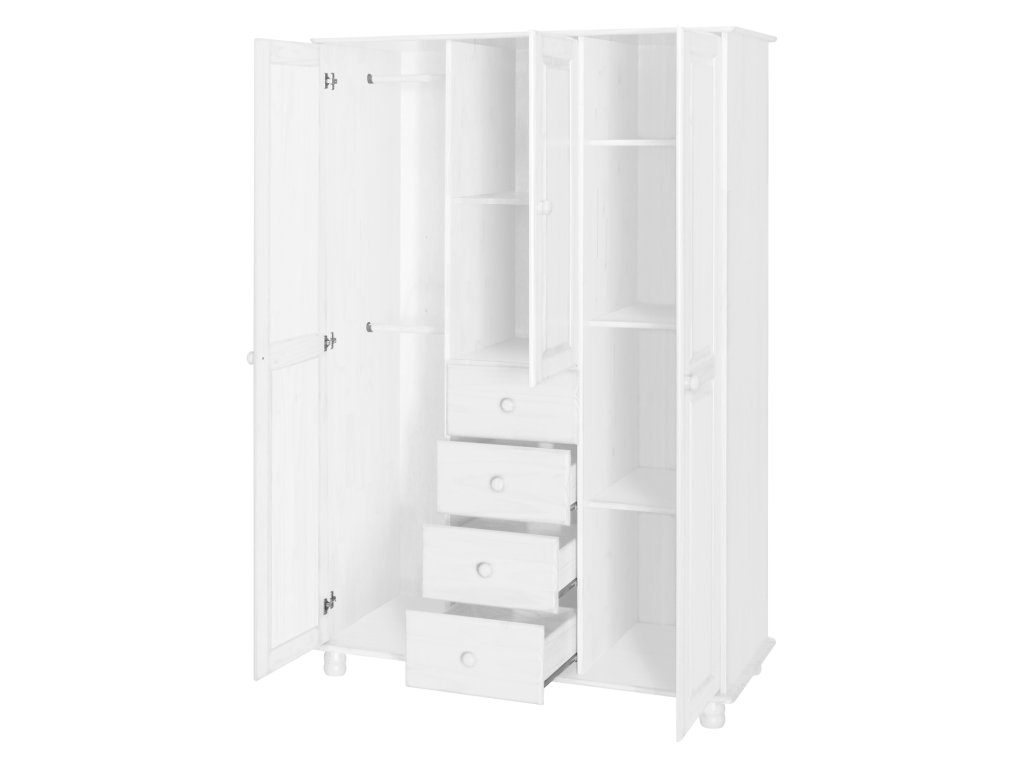 Materiál masiv borovice, barevné provedení bílý lakčtyři zásuvky s kovovými pojezdy, v levé části dvě šatní tyče, ve střední části 1 police a v pravé části 3 police