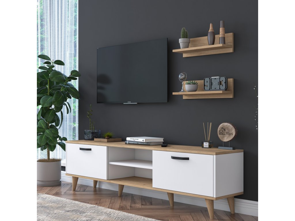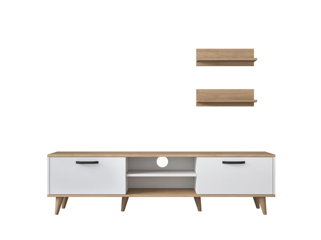 Obývací stěna TROPEA spojuje moderní design s praktickým uspořádáním pro každodenní pohodlí. Kombinace bílé a dekoru ořechu vytváří útulný a zároveň elegantní vzhled.