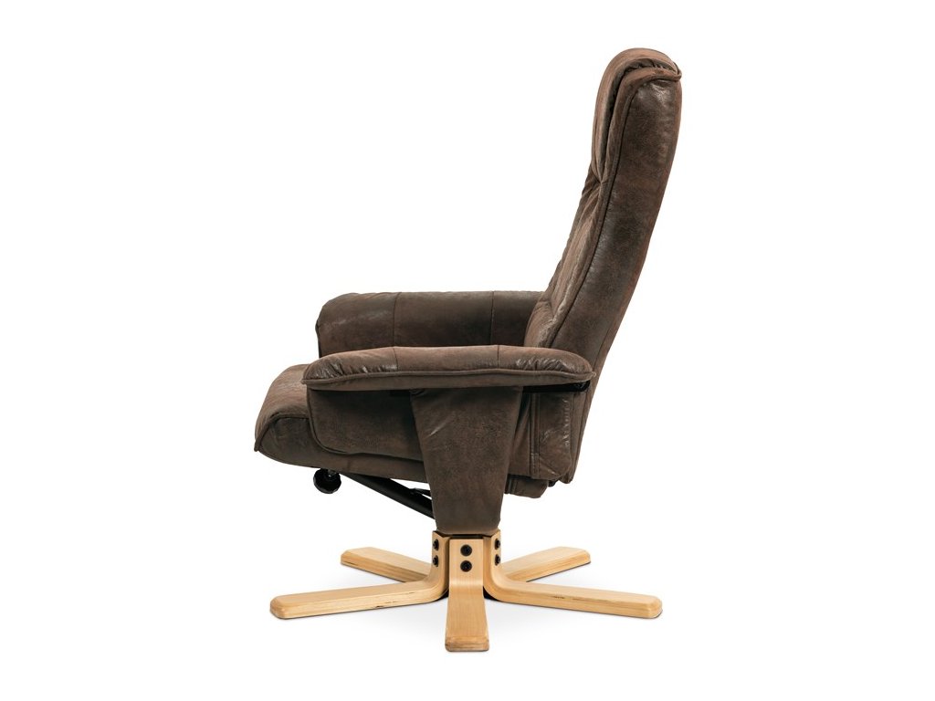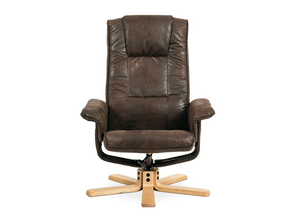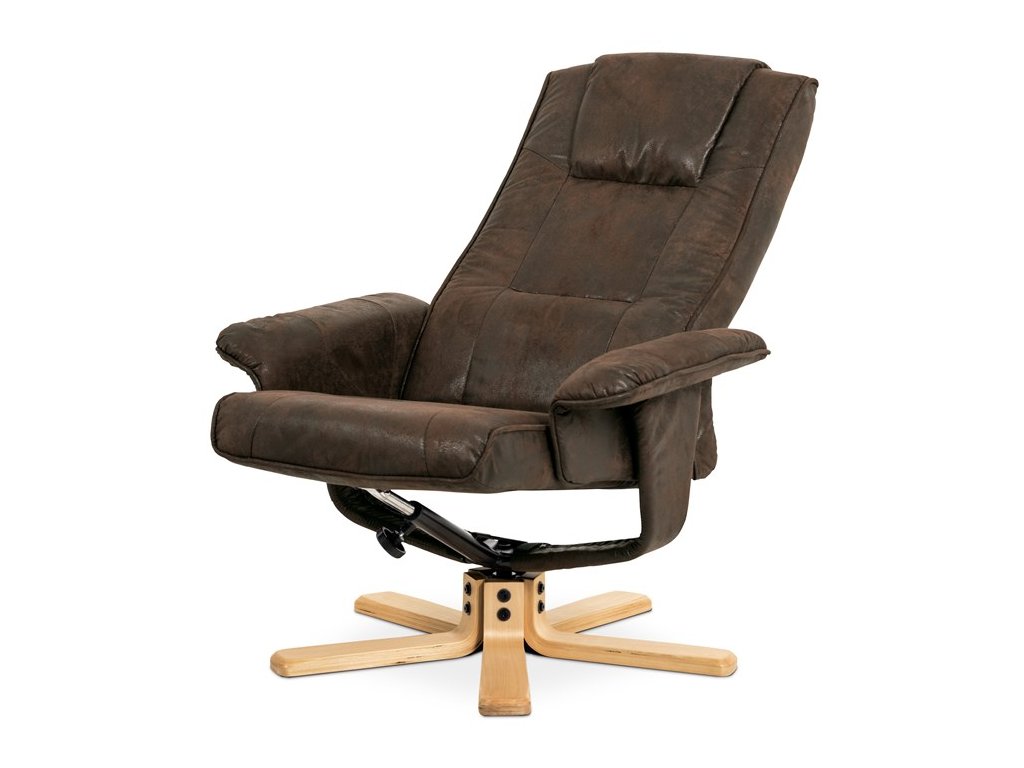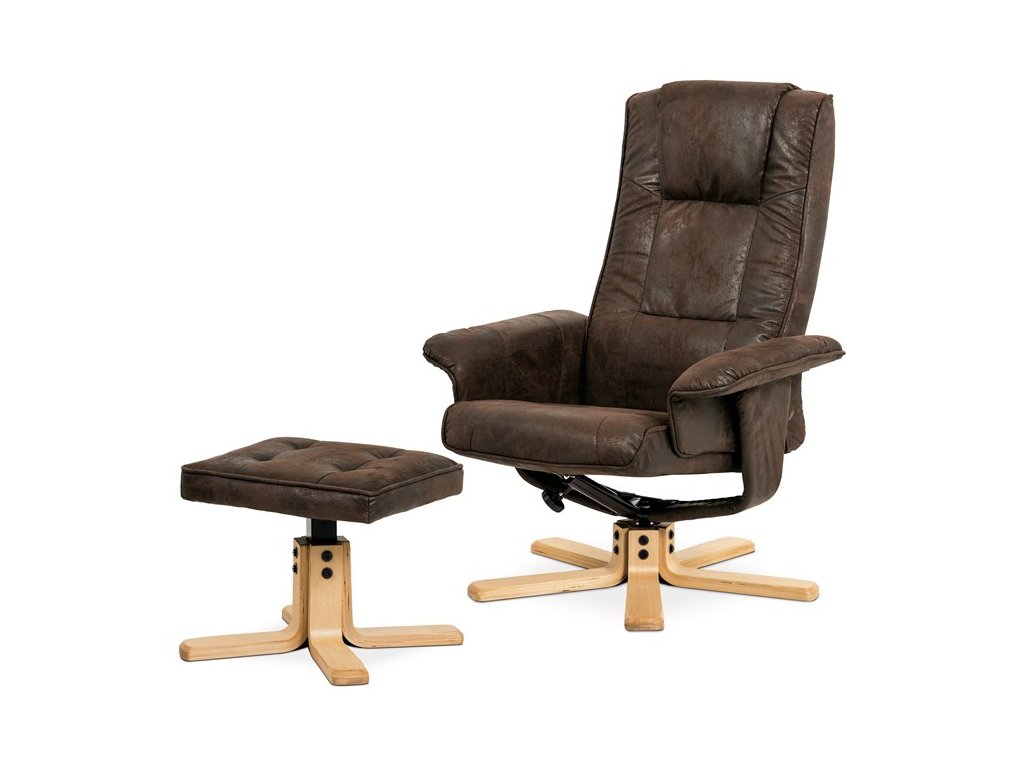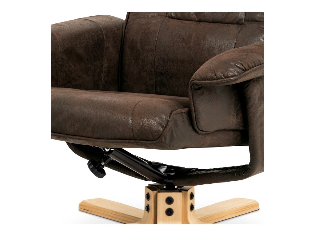 Pohodlné relaxační křeslo pro všechny milovníky kvalitního odpočinku. Křeslo s příjemný polstrováním a stylovým prošitím, je čalouněno jemnou látkou hnědé barvy imitující broušenou kůži. V rámci maximálního komfortu je křeslo polohovatelné, dle potřeby je ale možné polohování zafixovat velkým aretačním šroubem umístěným pod sedákem křesla. Díky tvrzenému kovovému rámu černé barvy, který je pevně uchycen na kovovém pístu je křeslo otočné. Dokonalou stabilitu zajišťuje hvězdicová podnož z masivního dřeva v přírodním odstínu. Ruce si můžete pohodlně opřít o příjemné područky, které mají na vnější straně kapsičky třeba na dálkové ovládání televize.Skvělým doplňkem křesla je i taburet se čtvercovým polstrovaným sedákem čalouněným hnědou látkou imitující broušenou kůž a se stylovým prošitími, který je na podnoži z masivního dřeva v přírodním odstínu.