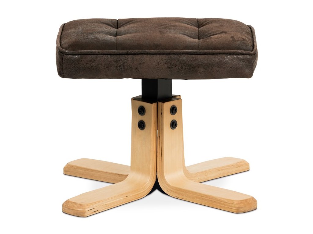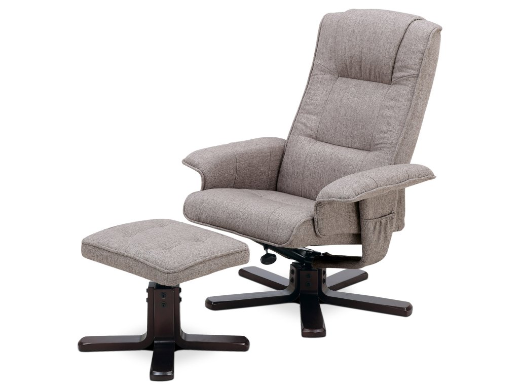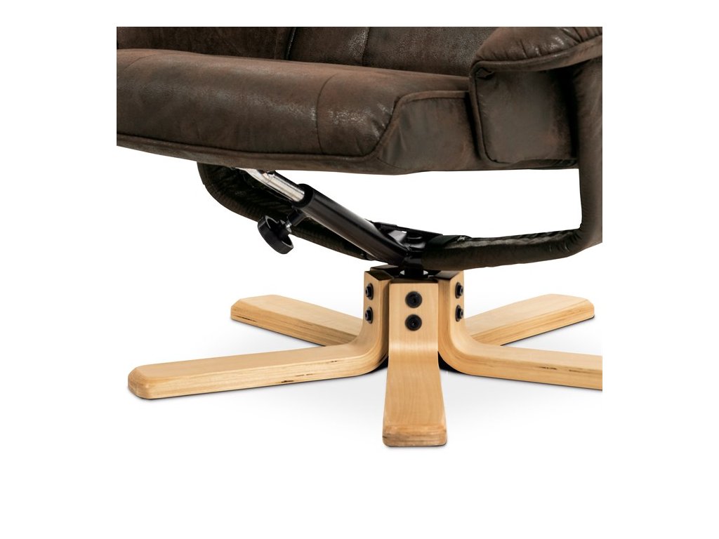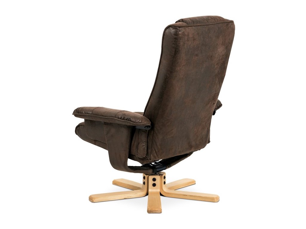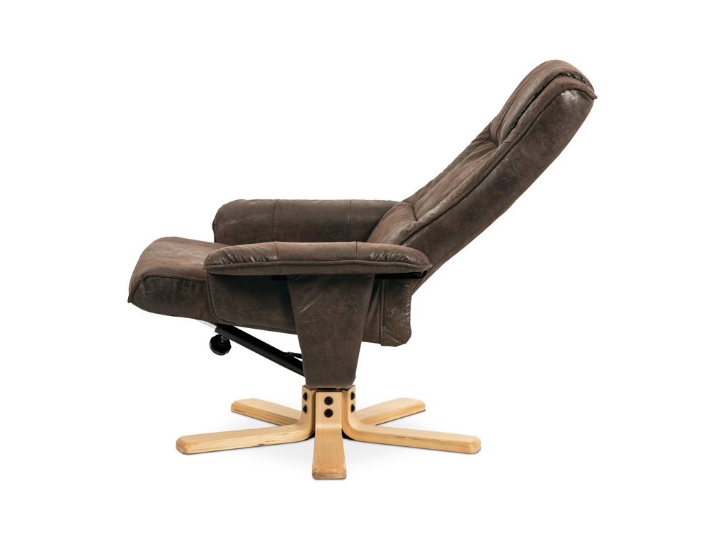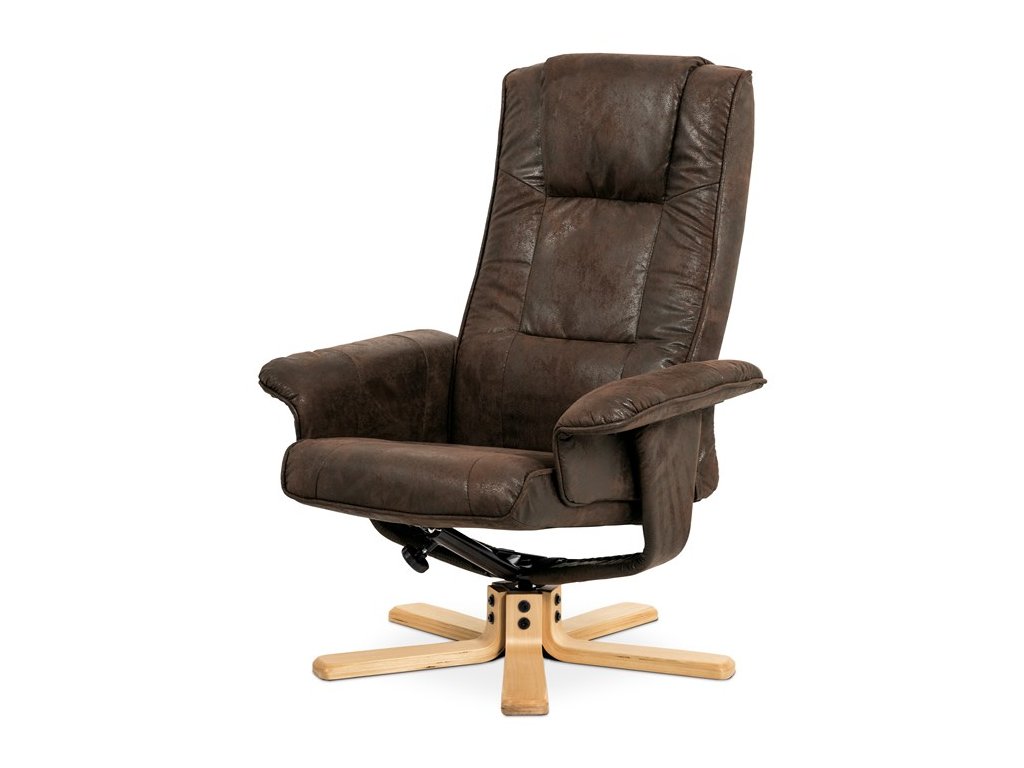 Pohodlné relaxační křeslo pro všechny milovníky kvalitního odpočinku. Křeslo s příjemný polstrováním a stylovým prošitím, je čalouněno jemnou látkou hnědé barvy imitující broušenou kůži. V rámci maximálního komfortu je křeslo polohovatelné, dle potřeby je ale možné polohování zafixovat velkým aretačním šroubem umístěným pod sedákem křesla. Díky tvrzenému kovovému rámu černé barvy, který je pevně uchycen na kovovém pístu je křeslo otočné. Dokonalou stabilitu zajišťuje hvězdicová podnož z masivního dřeva v přírodním odstínu. Ruce si můžete pohodlně opřít o příjemné područky, které mají na vnější straně kapsičky třeba na dálkové ovládání televize.Skvělým doplňkem křesla je i taburet se čtvercovým polstrovaným sedákem čalouněným hnědou látkou imitující broušenou kůž a se stylovým prošitími, který je na podnoži z masivního dřeva v přírodním odstínu.