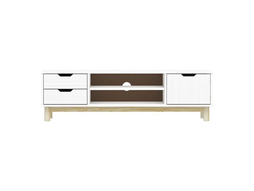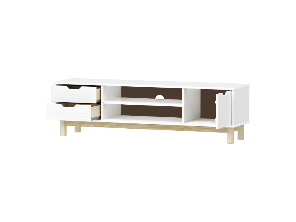 TV stolek BONITO 2 bílý lak 324101B je praktický televizní stolek z masivu, který nabízí přehledný úložný prostor pro elektroniku i drobnosti v obývacím pokoji. Je vyrobený z masivní borovice a má povrch v bílém laku, díky čemuž působí čistě, nadčasově a snadno se kombinuje s dalším nábytkem.Stolek je vybavený 1 dvířky a uvnitř má 1 polici pro uložení zařízení nebo příslušenství. Dále nabízí 2 zásuvky s kovovými pojezdy, které se plynule vysouvají a jsou ideální na ovladače, kabely nebo další drobnosti. Praktickým detailem je také otvor na protažení kabelů, který pomůže udržet prostor kolem TV přehledný a uspořádaný.
