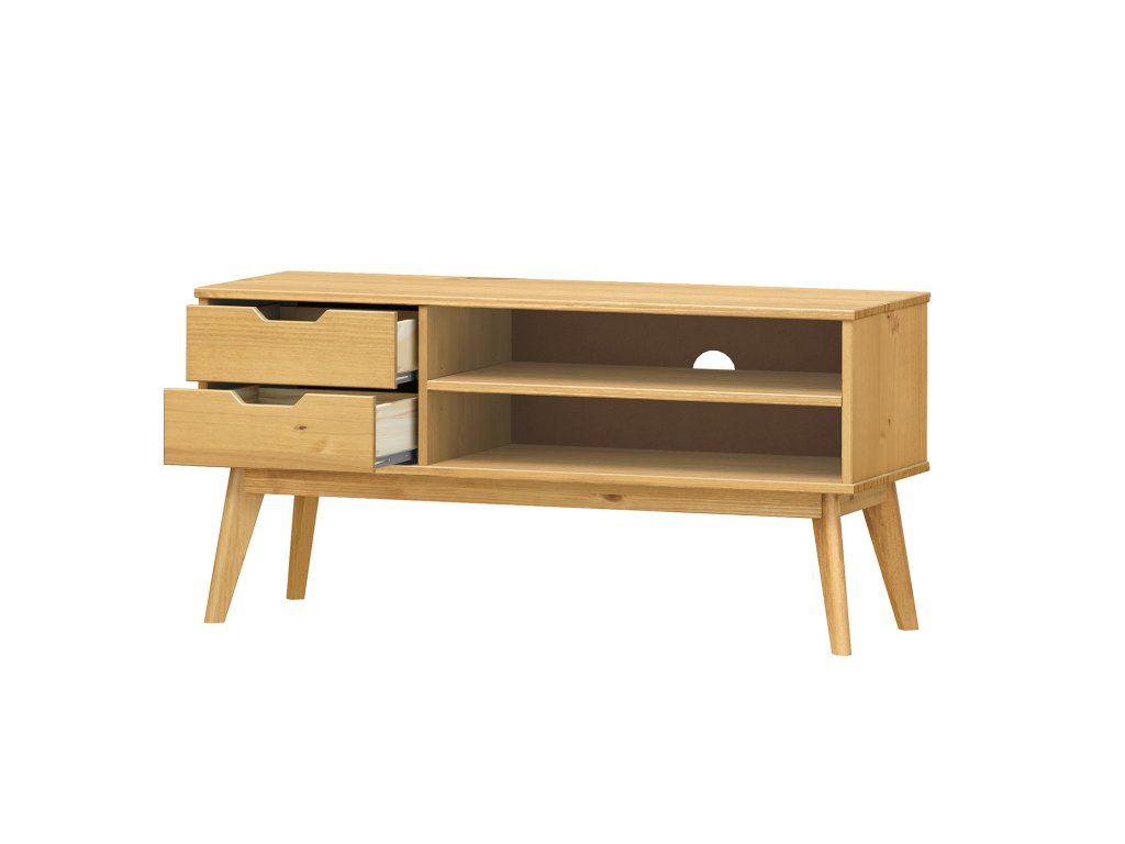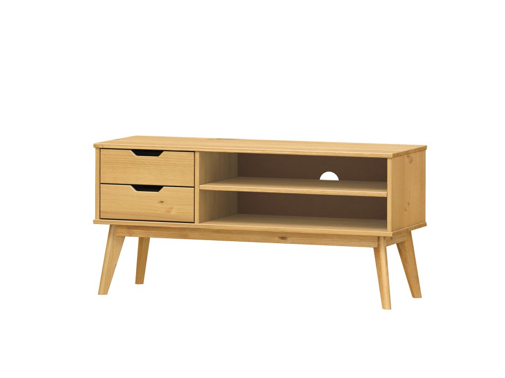 Televizní stolek, materiál masiv borovice voskovaná v medovém odstínu, 2 zásuvky s kovovými pojezdy, 1 police otvor na protažení kabelů.Doplňkové parametry