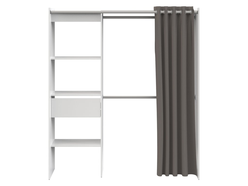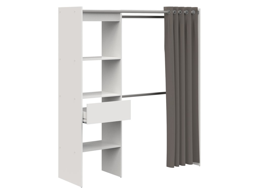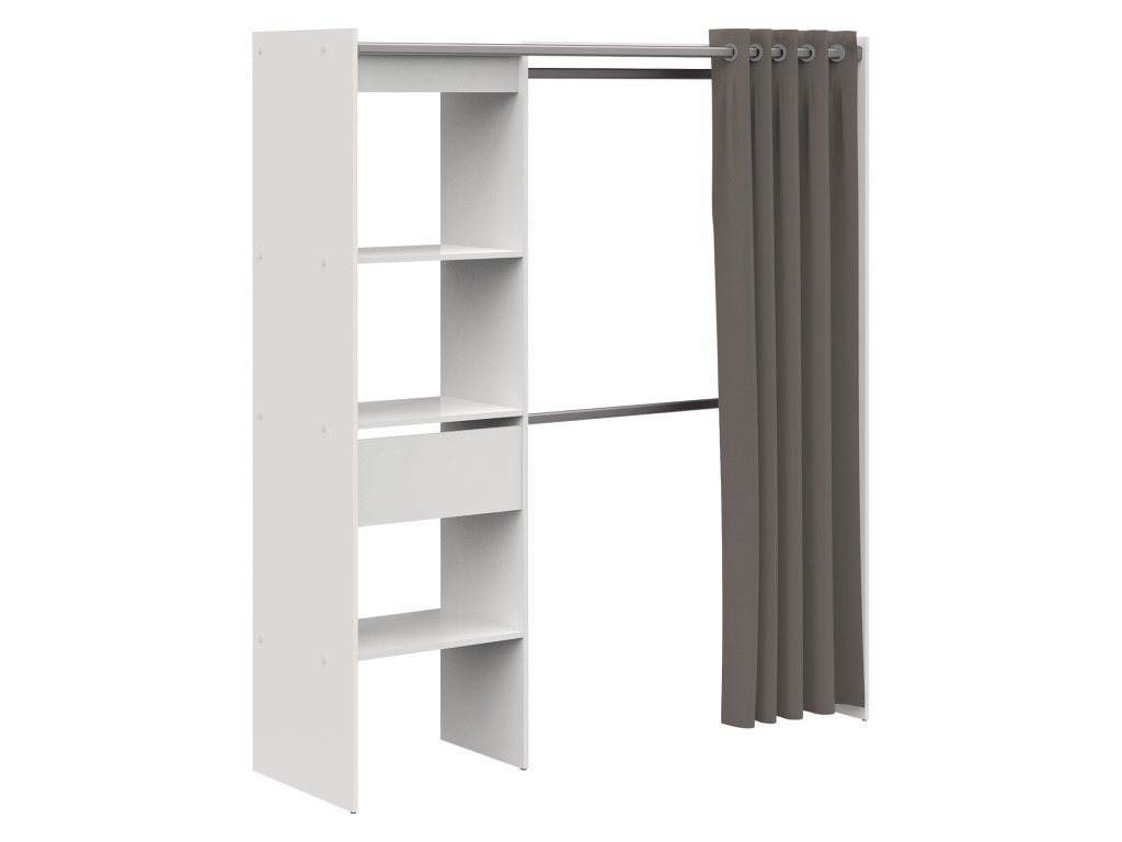 Úložný prostor/skříň se závěsem CHICAGO v bílém provedení je praktickým řešením pro vaši ložnici či šatnu. Nabízí nastavitelnou šířku od 114 do 169 cm, což umožňuje přizpůsobení vašim potřebám. Součástí jsou tři prostorné police, zásuvka s kovovými pojezdy a dvě kovové šatní tyče, které poskytují dostatek místa pro vaše oblečení. Bavlněný závěs s 12 otvory pro zavěšení zajišťuje snadný přístup a elegantní vzhled.Tato šatní skříň v bílém barevném provedení je navržena s důrazem na funkčnost a estetiku. Její nastavitelná šířka od 114 do 169 cm umožňuje flexibilní umístění v různých prostorech, ať už v ložnici, šatně nebo studentském pokoji. Skříň disponuje třemi policemi o rozměrech 57 × 40 cm, ideálními pro uložení složeného oblečení či doplňků. Dále je vybavena zásuvkou s kovovými pojezdy o rozměrech 52 × 31 × 11 cm, vhodnou pro uschování drobností nebo spodního prádla. Dvě kovové šatní tyče o délce 108 cm poskytují dostatek prostoru pro zavěšení košil, šatů či kabátů. Bavlněný závěs s rozměry 203 × 190 cm a 12 otvory pro zavěšení nejen chrání vaše oblečení před prachem, ale také dodává skříni moderní a čistý vzhled. Díky svému promyšlenému designu a kvalitnímu zpracování je tato skříň ideální volbou pro ty, kteří hledají praktické a stylové úložné řešení.