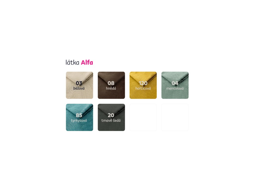 Možnost objednat v 6 barevných provedeních látky Alfa v ceně 20.990 Kč. Při individuální objednávce je třeba zaplatit 10% zálohu z dané částky. Po uhrazení zálohy bude Váš požadavek zadána do výroby. Doba dodání 8-10 týdnů.