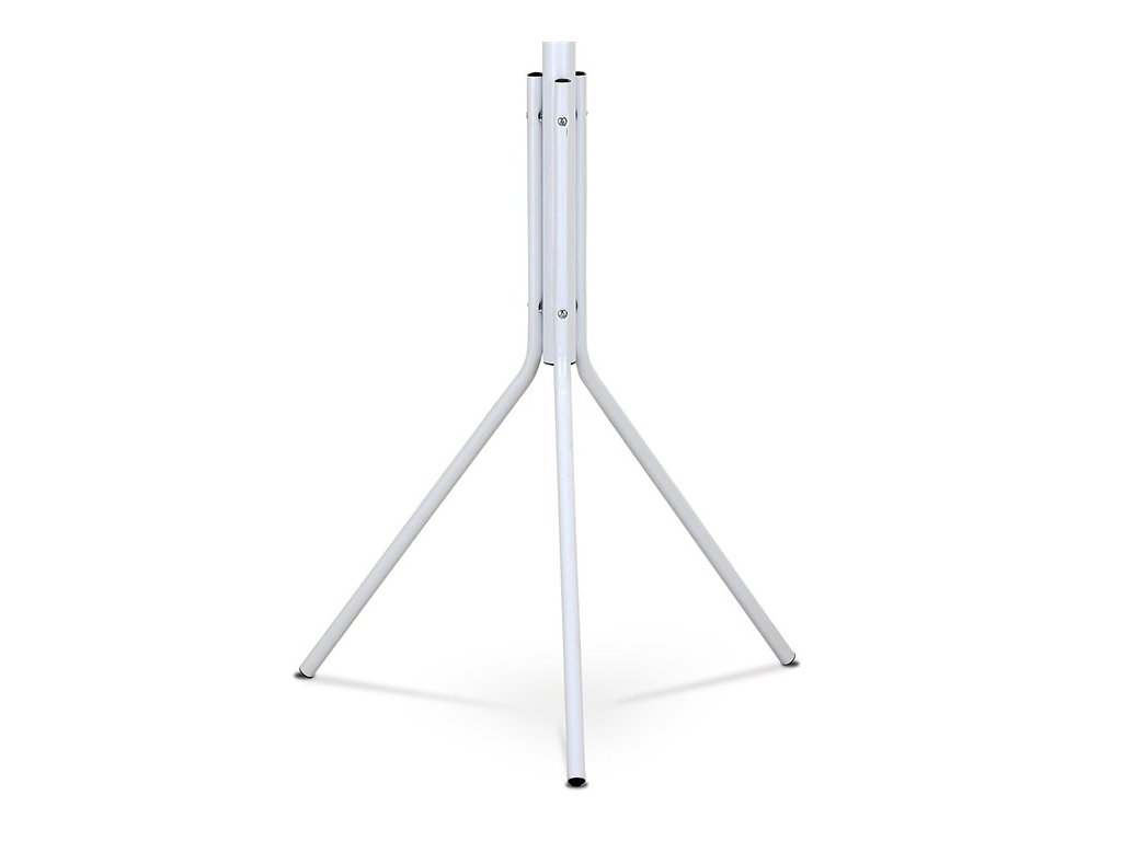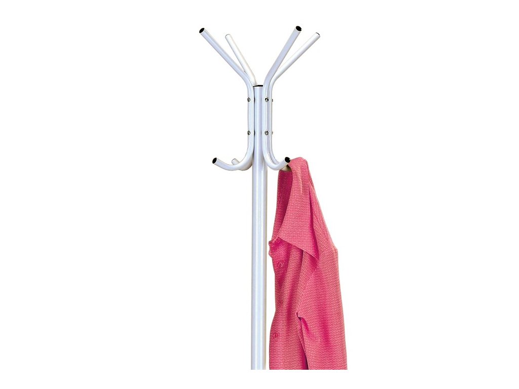 Kovový, volně stojící věšák v minimalistickém designu. Stabilní a lehká konstrukce je z kovových trubek v bílém matném laku a s černými plastovými záslepkami. Nohy jsou opatřeny plastovými kluzáky k minimalizování poškození podlahy. Dodáván v demontovaném stavu. Výška je 174 cm, celková nosnost je 6 kg.Je to originální doplněk interiéru, v každém si jistě najde zasloužené a funkční místo a uplatnění.