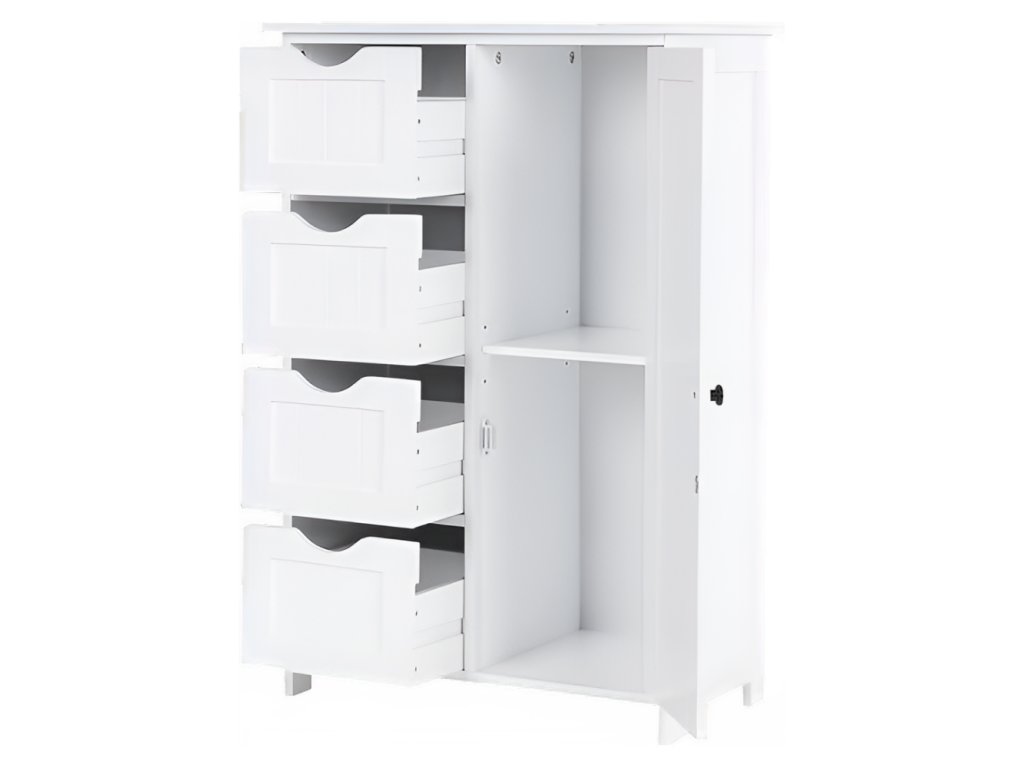 Víceúčelová skříňka/regál STORMI v bílé barvě spojuje funkčnost a elegantní design. Díky kombinaci zásuvek, polic a skříňky získáte praktické řešení pro každý interiér.✔ Materiál MDF (1,2 cm), barva bílá