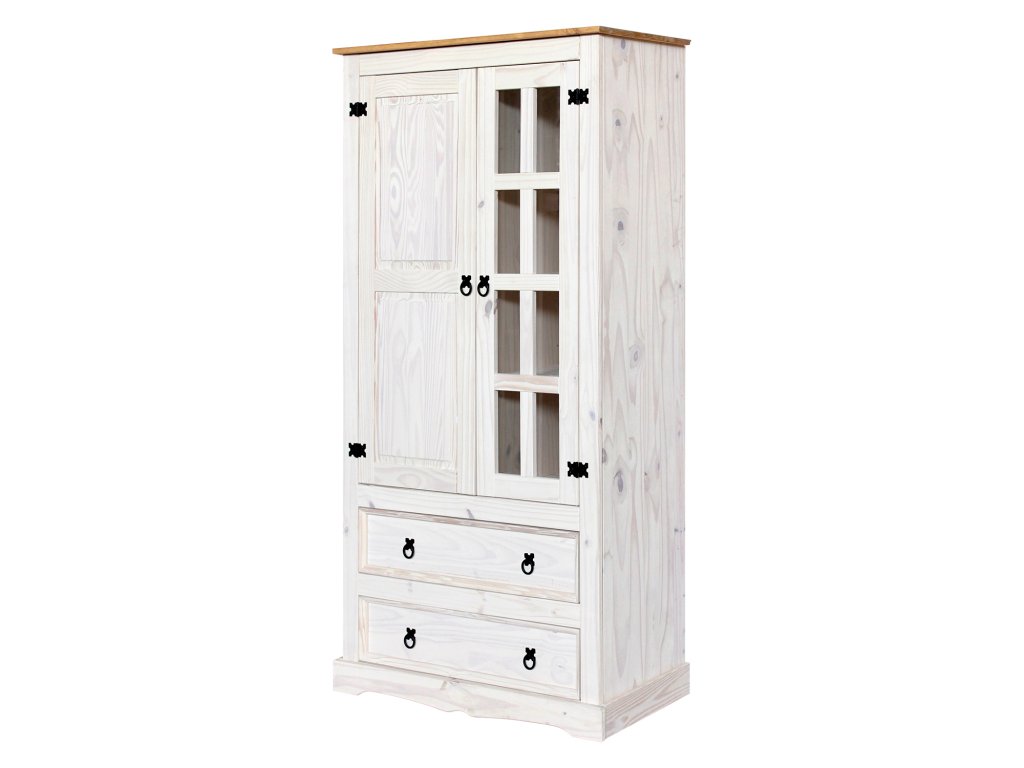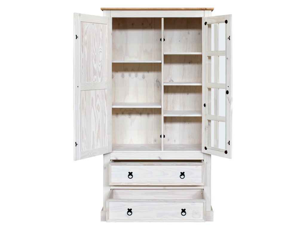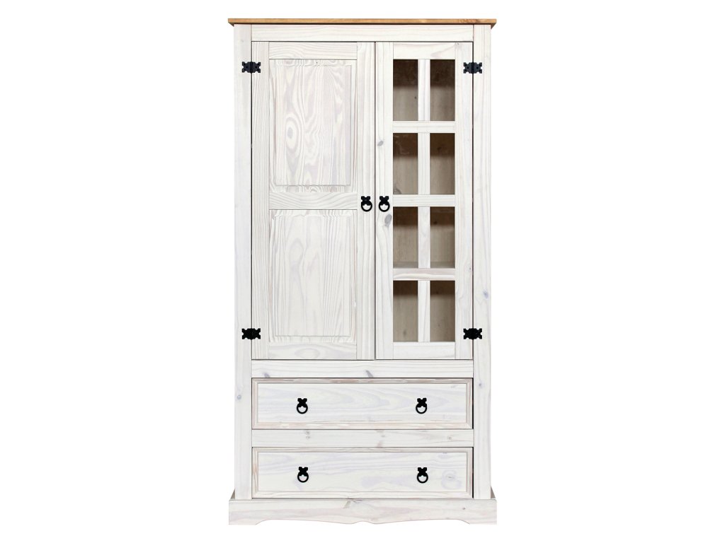 Materiál masiv borovice voskovaná v bílém odstínu, horní deska masiv borovice voskovaná v medovém odstínuprosklená část, 3 police, 1 plná dvířka, 2 velké zásuvky