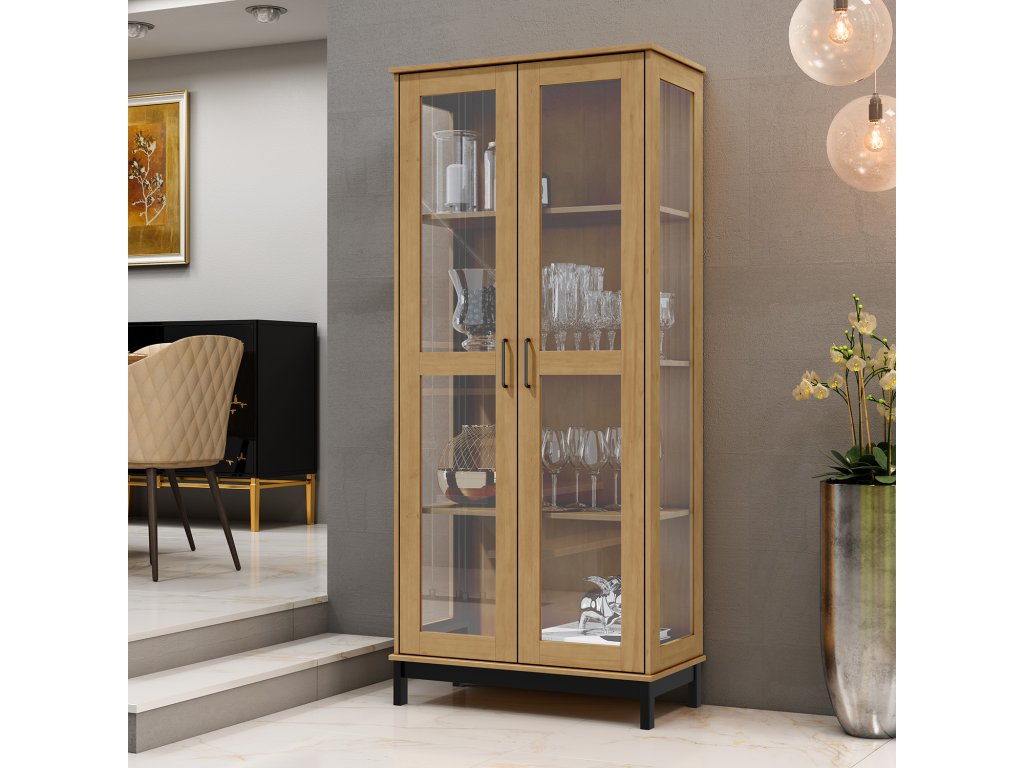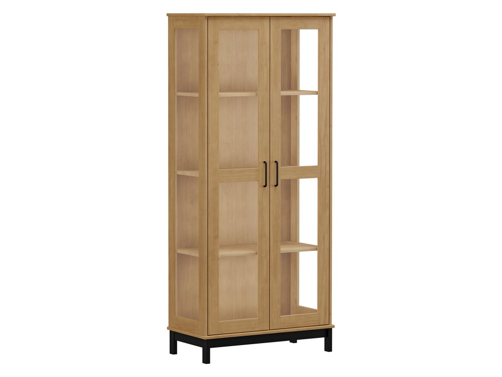 materiál masiv borovice, barevné provedení buk, černé nohy, černé kovové úchytky3 police, 2 prosklené dveřeDoplňkové parametry
