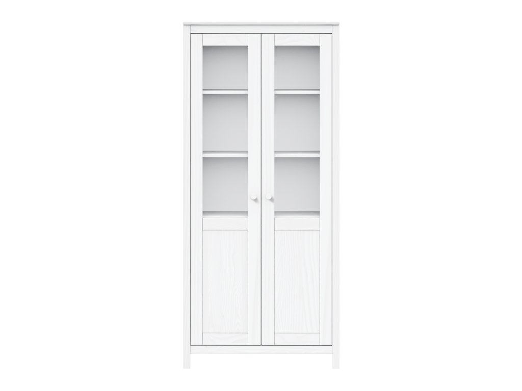 Vitrína, materiál masiv borovice, barevné provedení bílý lak, dvoje částečně prosklené dveře, čtyři police.Doplňkové parametry