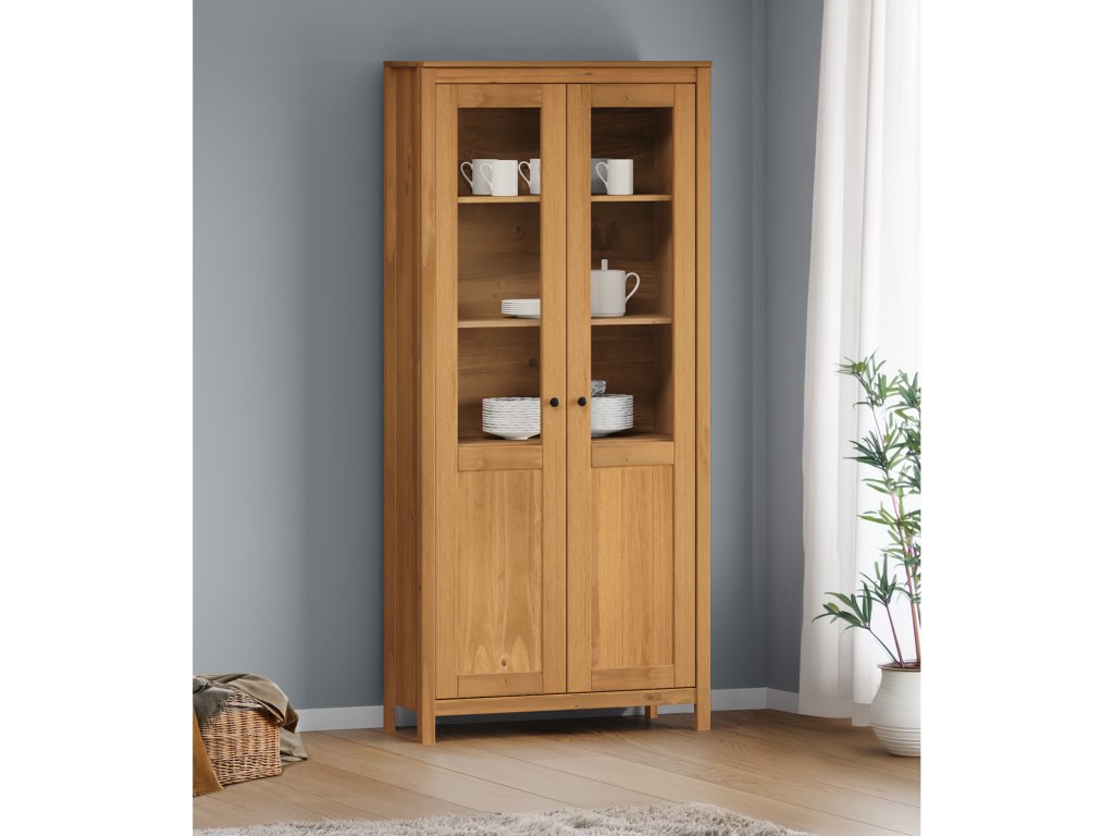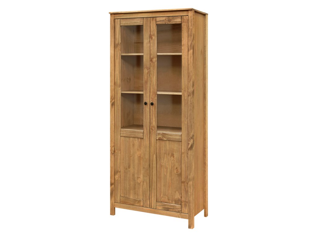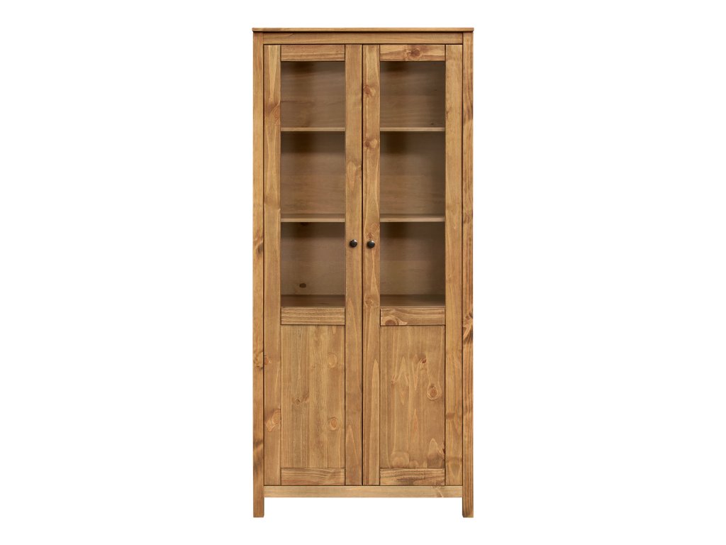 Vitrína, materiál masiv borovice voskovaná v medovém odstínu, kovové úchytky v barevném provedení černěná mosaz, dvoje částečně prosklené dveře, čtyři police.Doplňkové parametry