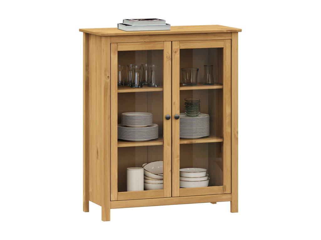 Vitrína TORINO vosk 8061V je elegantní vitrína z masivu, která se hodí do jídelny, obývacího pokoje i kuchyně. Je vyrobená z masivní borovice a povrch je ošetřen voskem v medovém odstínu, který zvýrazňuje kresbu dřeva a dodává vitríně teplý, přírodní vzhled. Design doplňují kovové úchytky v provedení černěná mosaz, typické pro kolekci TORINO.Vitrína má 2 prosklené dveře, díky kterým můžeš uložené věci přehledně vystavit a zároveň je mít chráněné. Uvnitř se nachází 2 police pro organizované uložení. Informace o maximální nosnosti jsou uvedeny v návodu k montáži.