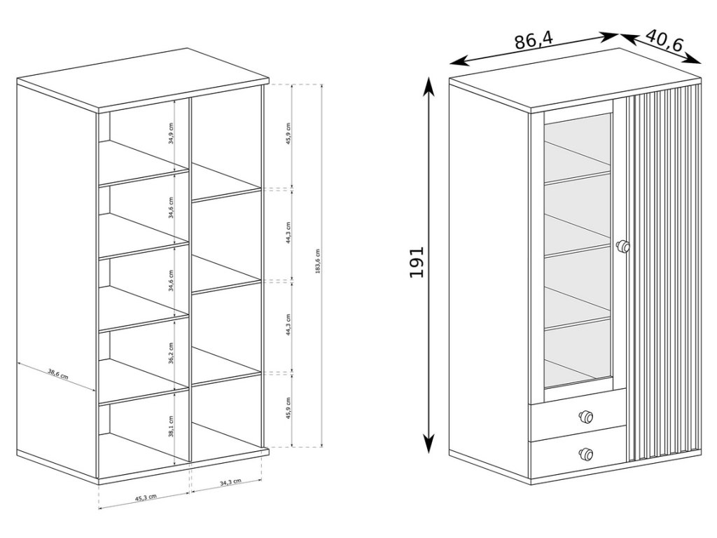 Vitrína dvoudveřová se dvěma zásuvkami s netradičním provedením detailu dvířek s lamelami. Kolekce nábytku v sobě spojuje jednoduchost, originální vzhled a funkčnost. Barevné provedení je v kombinaci dub artisan/černá mat. Nábytek je vyroben z kvalitního lamina ohraničeného ABS páskou, dekorační lamely jsou vyrobeny z desky MDF. Zásuvky jsou vybaveny kovovými pojezdy se systémem tichého dovírání. Kolekce se skládá z mnoha prvků a tento široký výběr Vám zaručí sestavit si nábytek podle svých vlastních představ a přání. Možnost dokoupení LED osvětlení. Dodáváme v demontovaném stavu.Doplňkové parametry