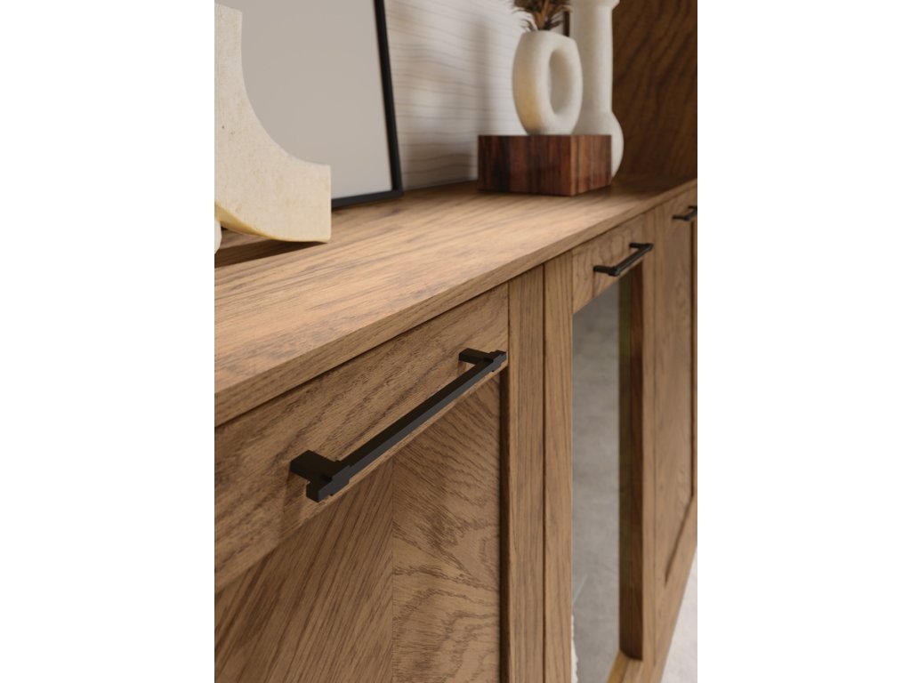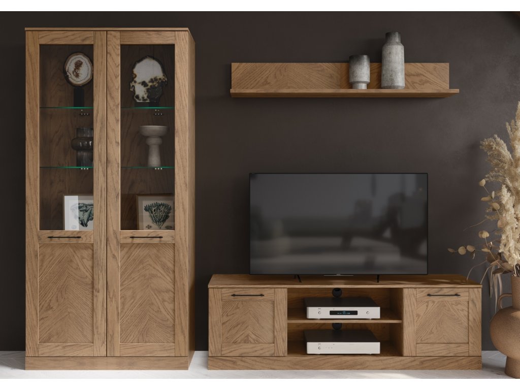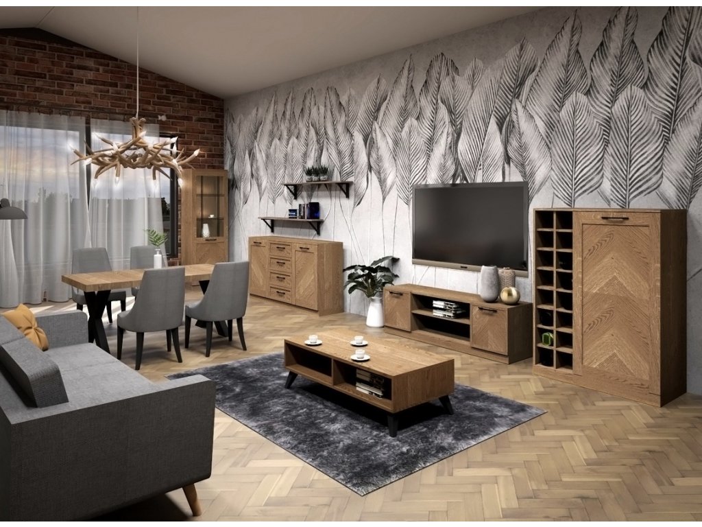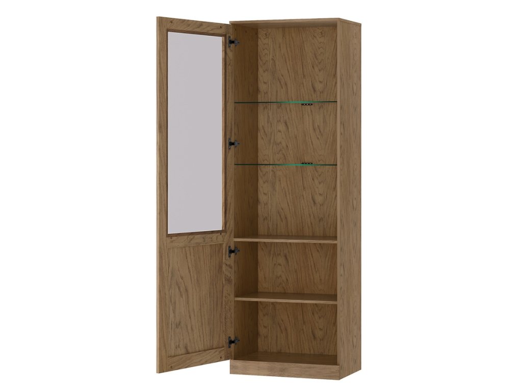 Vitrína jednodveřová v nadčasovém provedení. Korpus je vyroben z přírodní dýhy v barvě dub rustikální, dvířka jsou vyrobeny z masivu v kombinaci s přírodní dýhou v zajímavém dekoru rybí kost v provedení dub rustikální olejovaný. Součástí vitríny je také LED osvětlení. Úchyty jsou kovové v barvě černá mat. Dvířka disponují systémem tichého dovírání. Dodáváme již ve smontovaném stavu.Doplňkové parametry